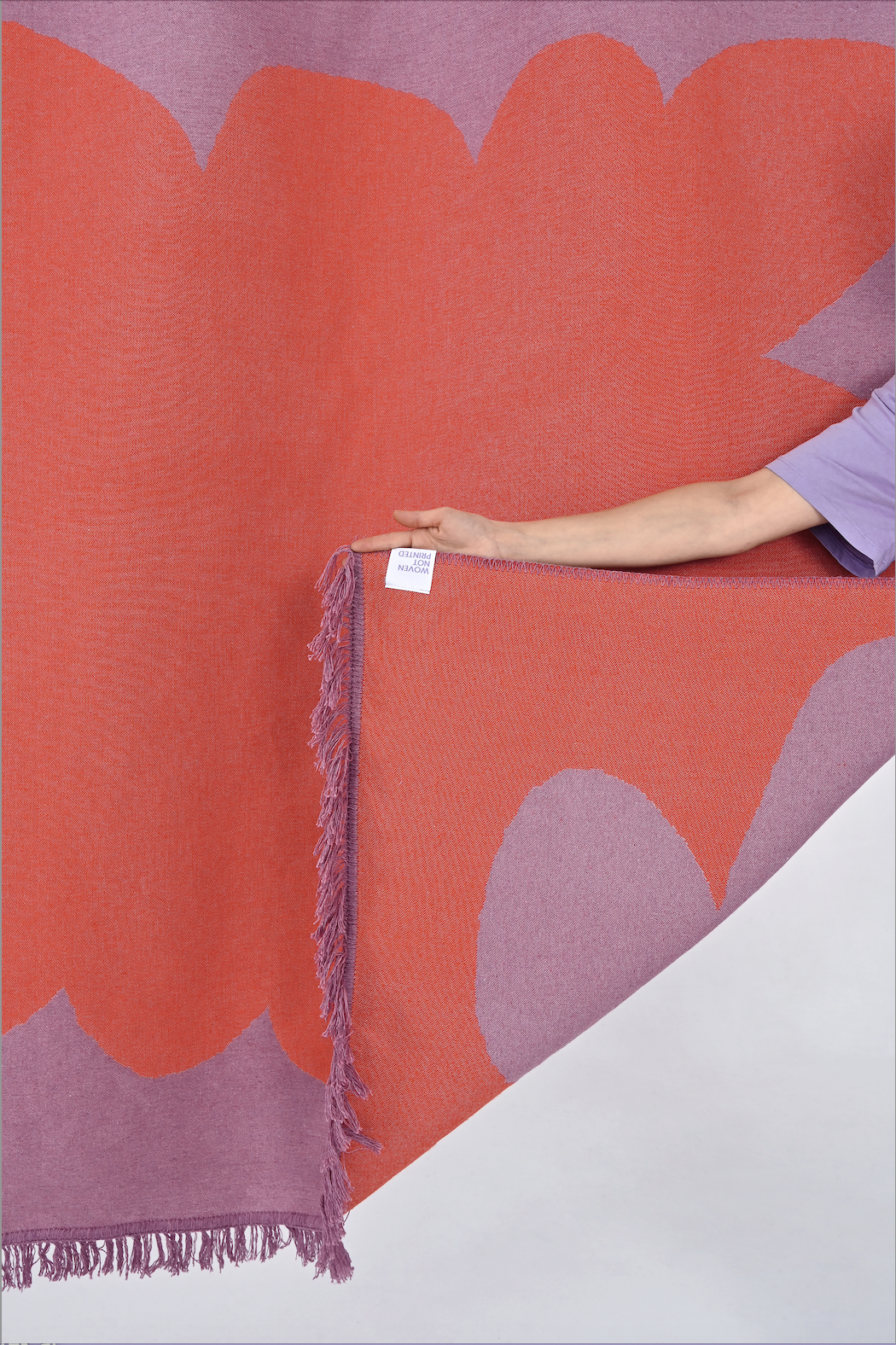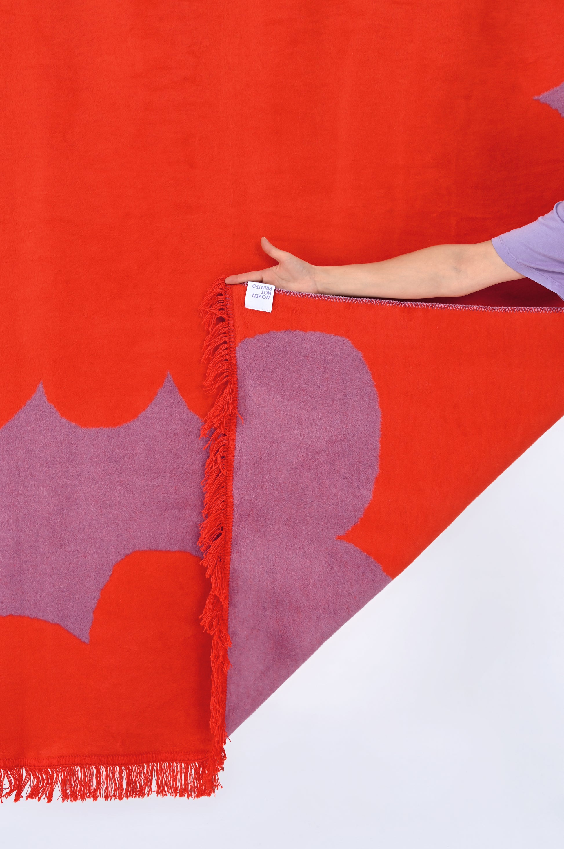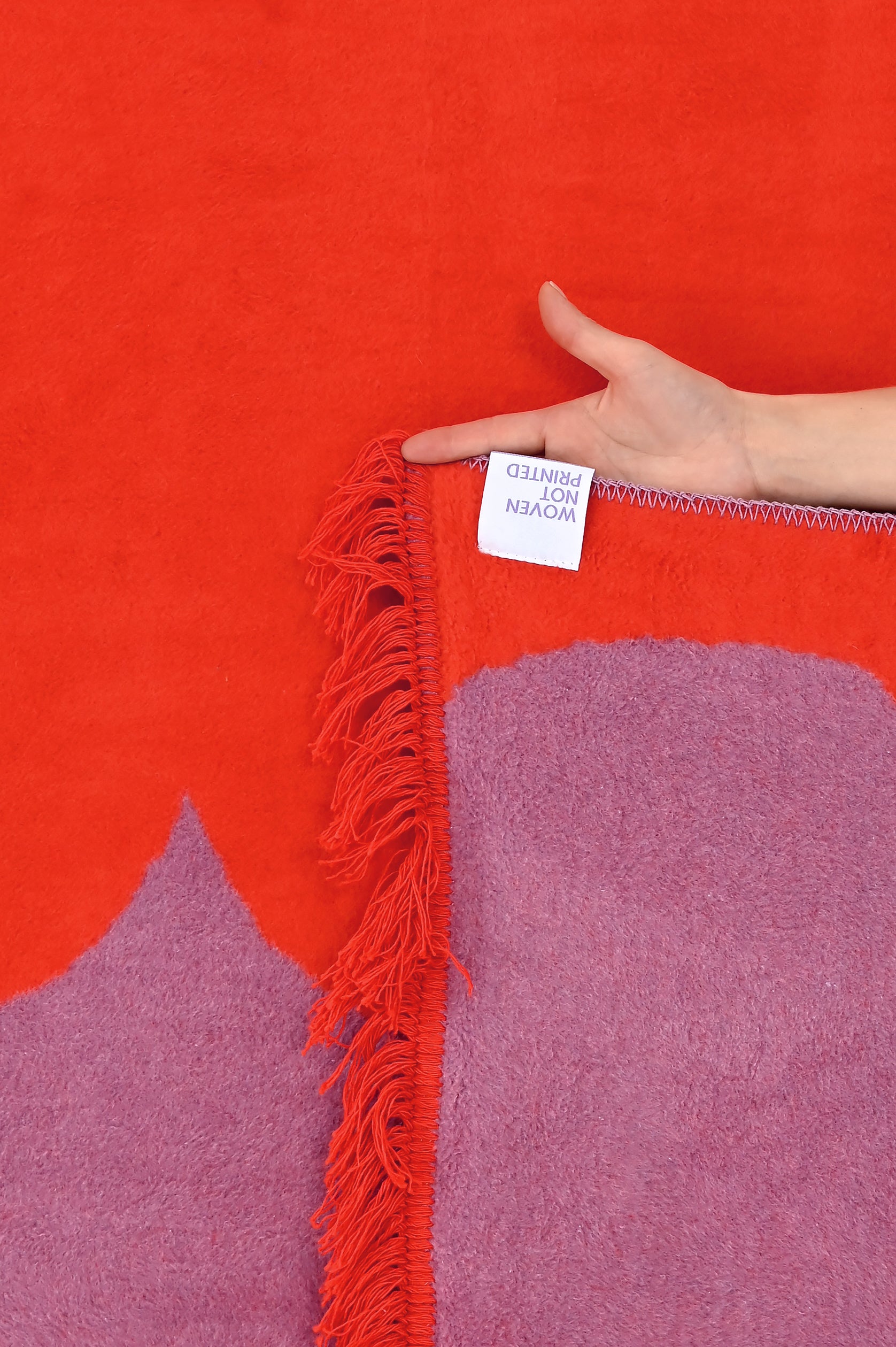 The pattern in the combed fabric version—a fluffy blanket—will be more intense in color than its counterpart in the smooth, unpiled fabric. This is due to the presence of fluff, which in the combed fabric covers the white warp threads. In the smooth version—a rug—this process is omitted, so the white warp in the composition brightens the pattern.