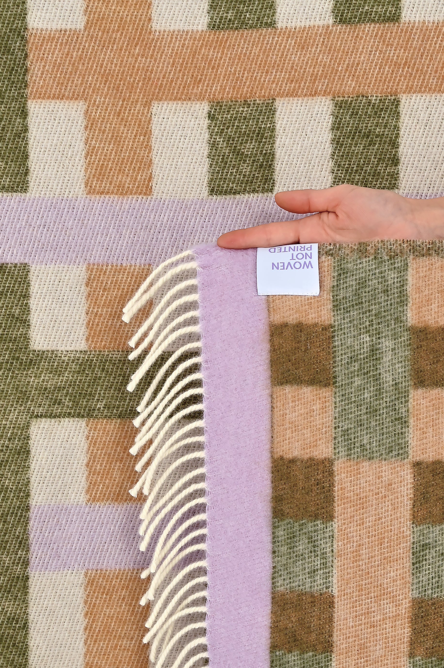 The HIPI jacquard wool blanket is a geometric deconstruction of the check pattern, combining olive green with delicate purple and caramel brown, balanced with delicate beige.