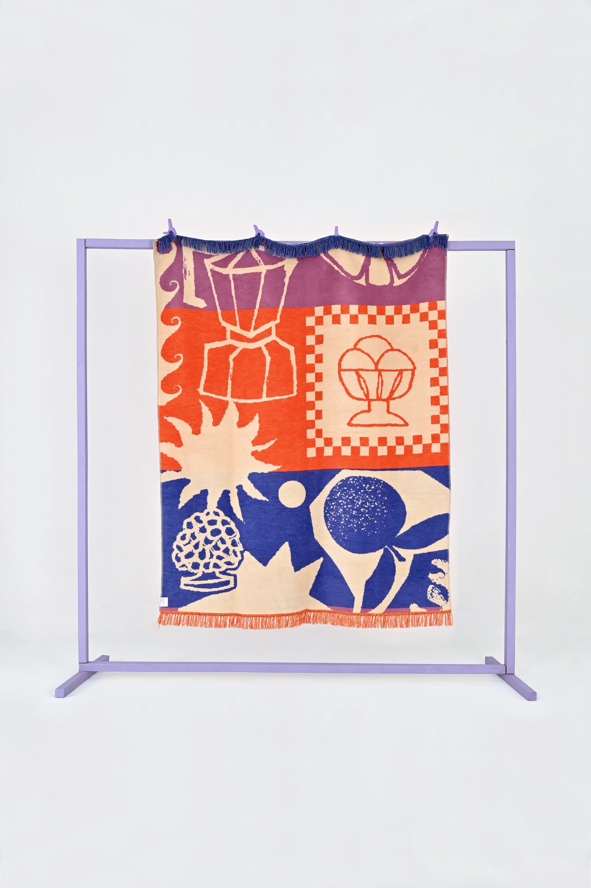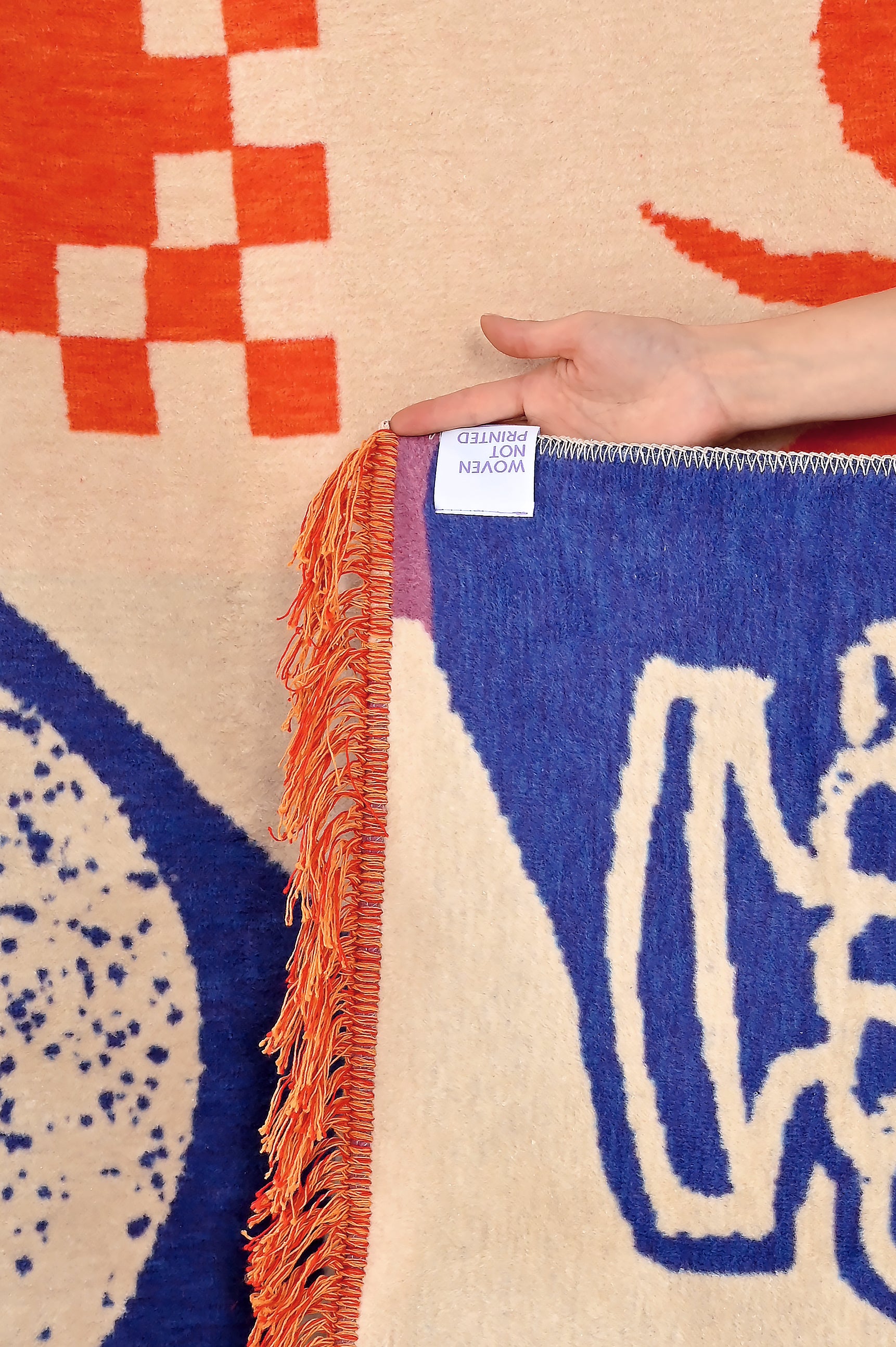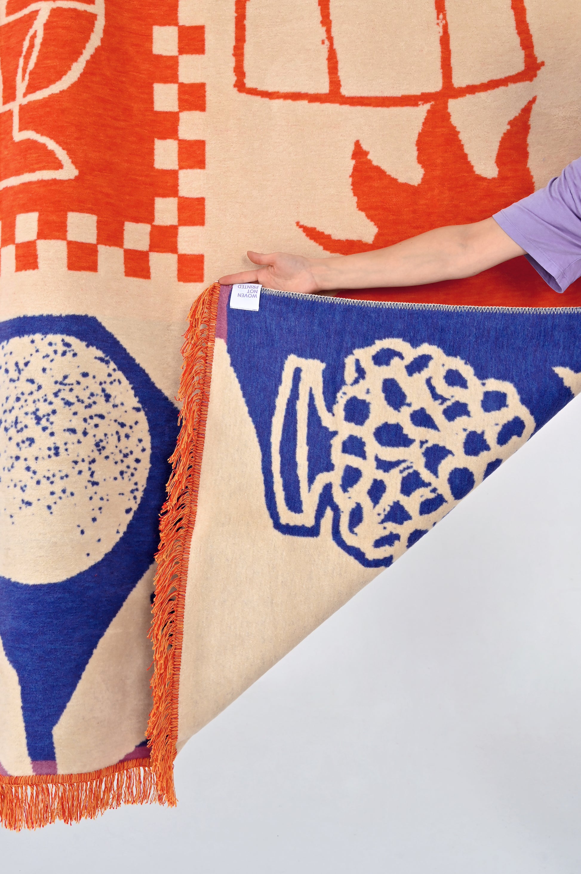 The pattern in the combed fabric version—a fluffy blanket—will be more intense in color than its counterpart in the smooth, unpiled fabric. This is due to the presence of fluff, which in the combed fabric covers the white warp threads. In the smooth version—a rug—this process is omitted, so the white warp in the composition brightens the pattern.