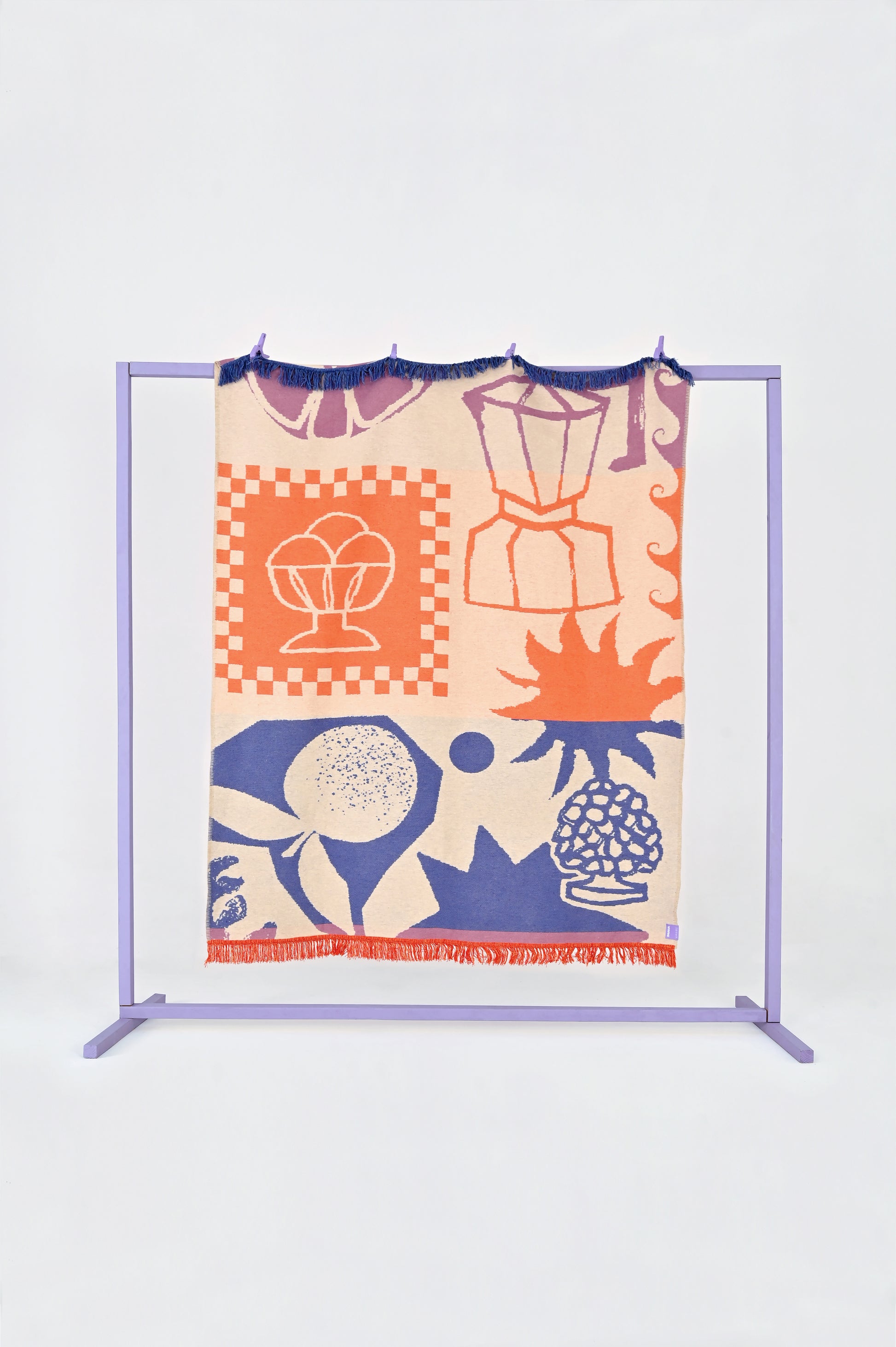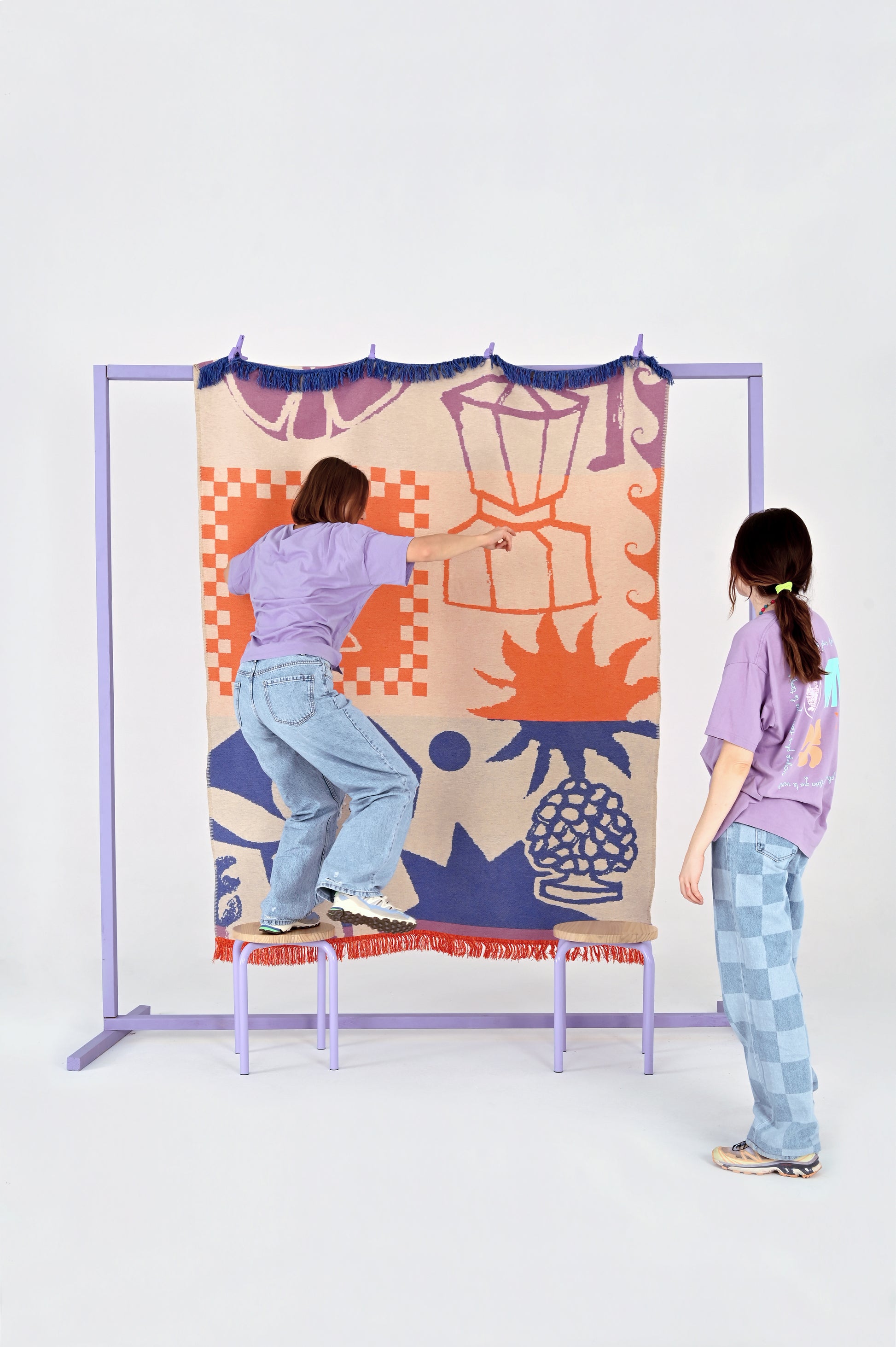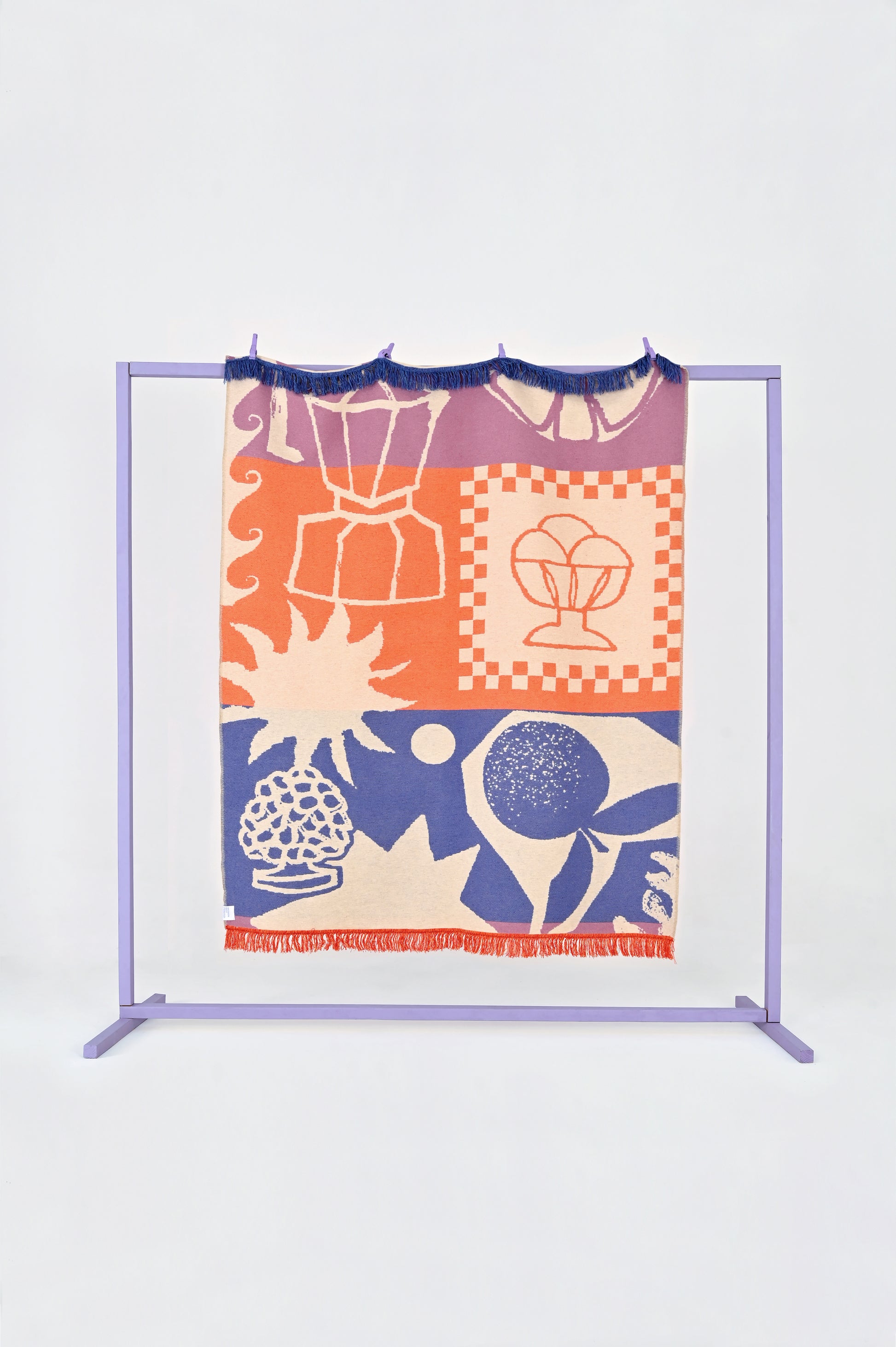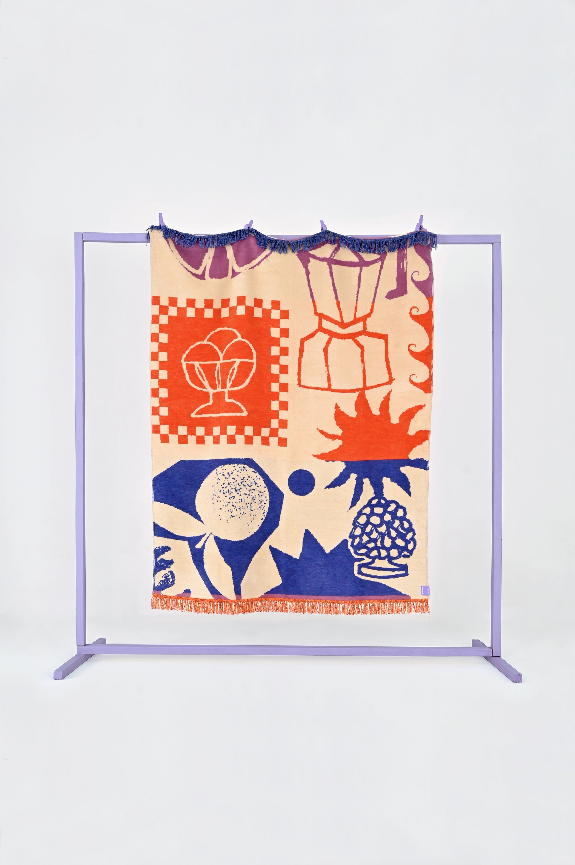 The pattern in the combed fabric version—a fluffy blanket—will be more intense in color than its counterpart in the smooth, unpiled fabric. This is due to the presence of fluff, which in the combed fabric covers the white warp threads. In the smooth version—a rug—this process is omitted, so the white warp in the composition brightens the pattern.