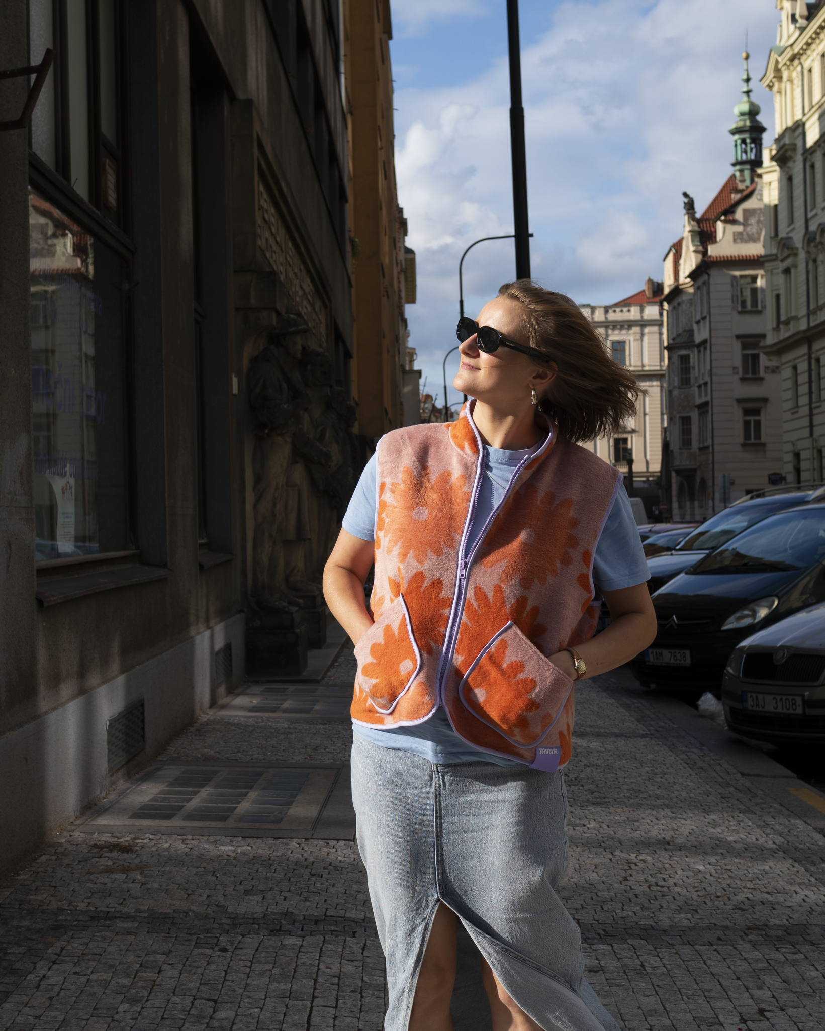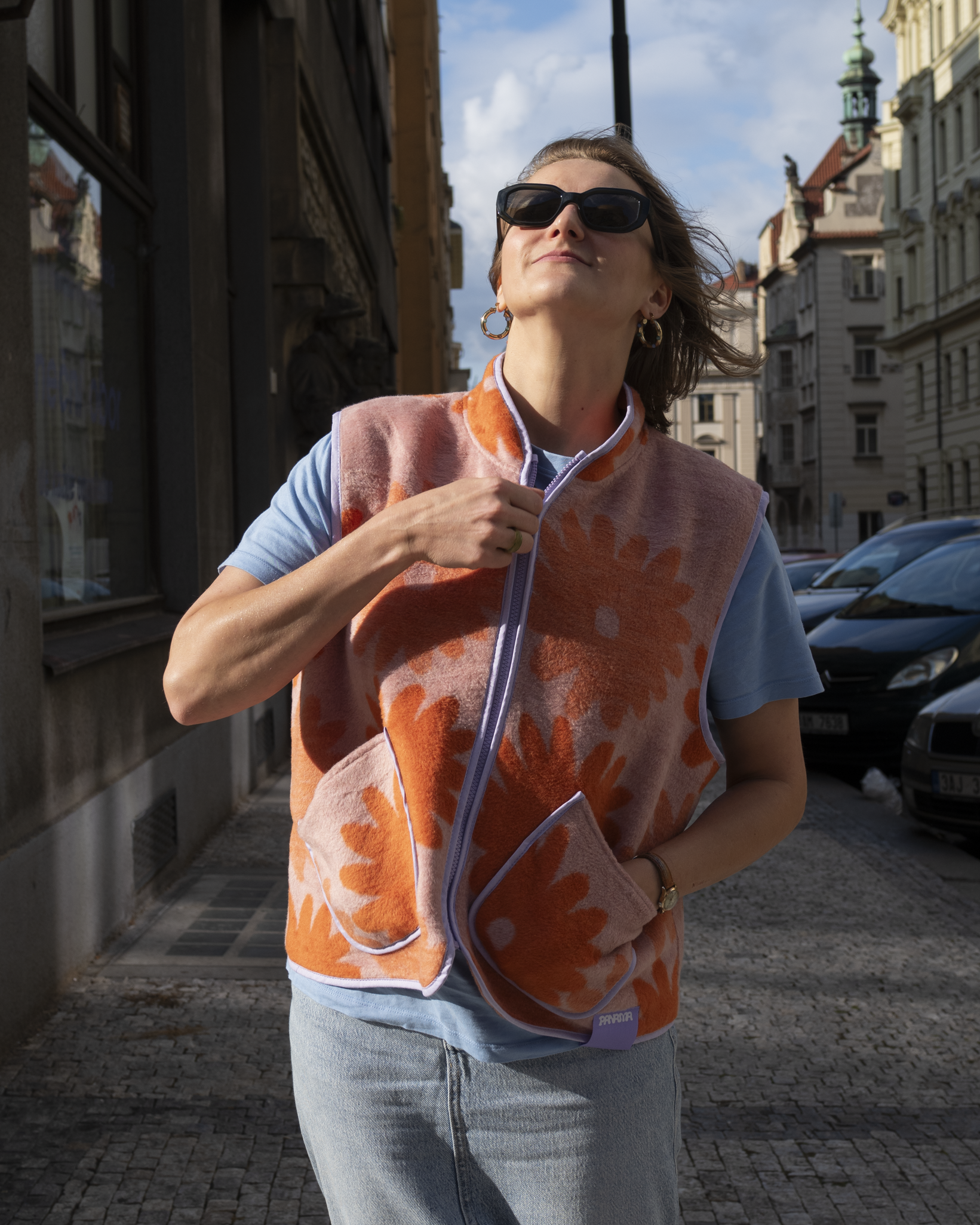 Orange, dusty pink, and flowers – that's the recipe for a warm and flattering vest. This pattern was the first and obvious choice for the vests. How else could it be?