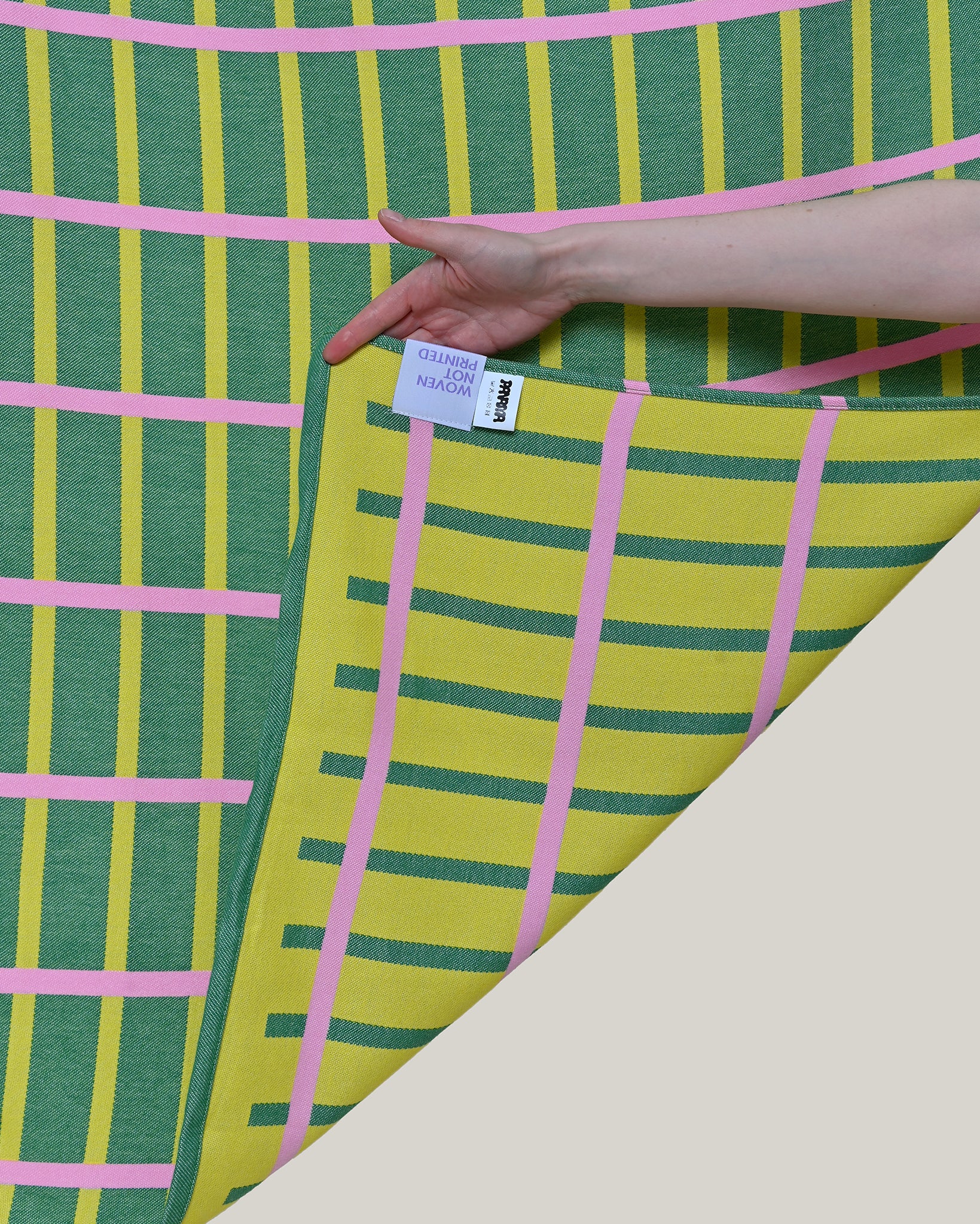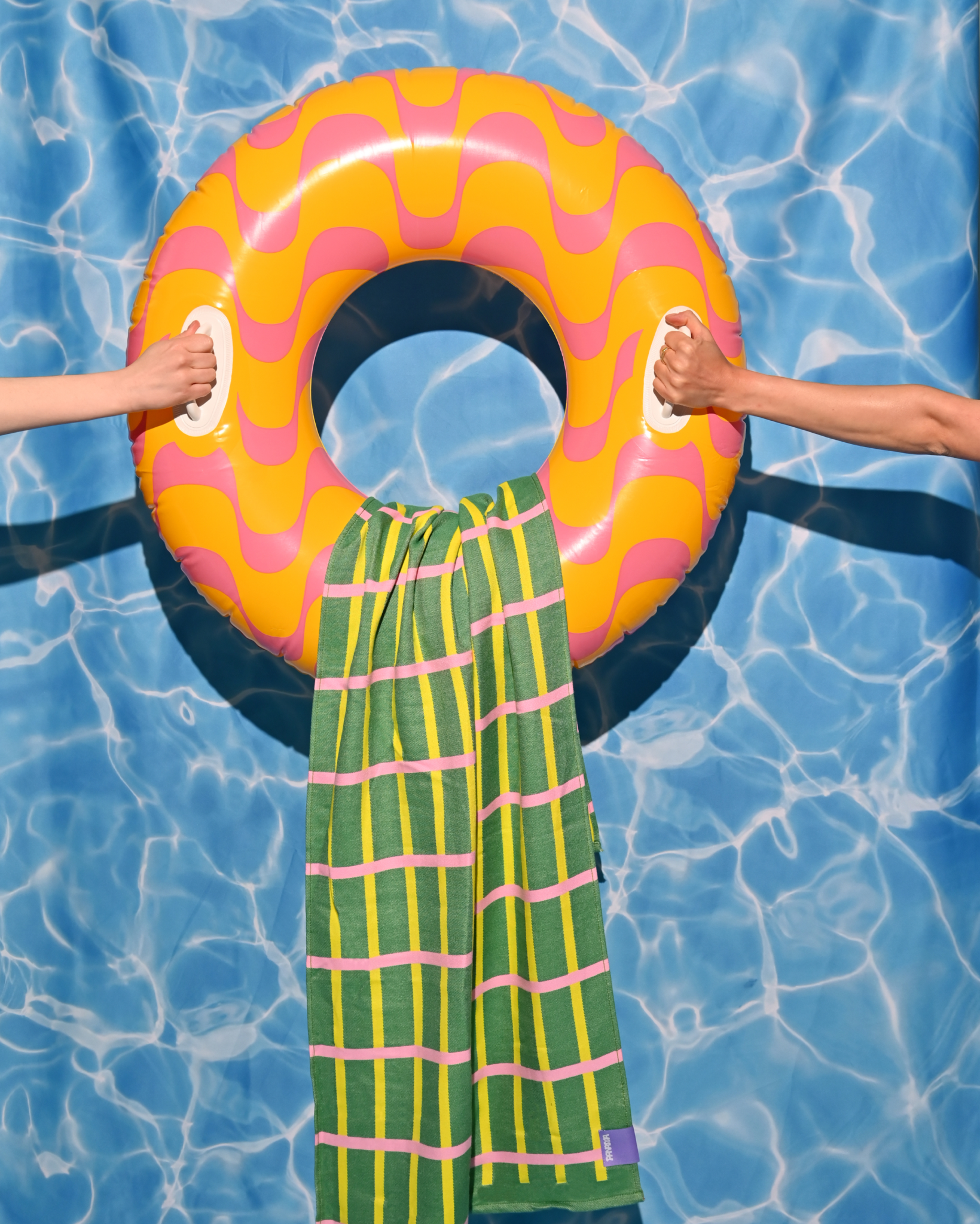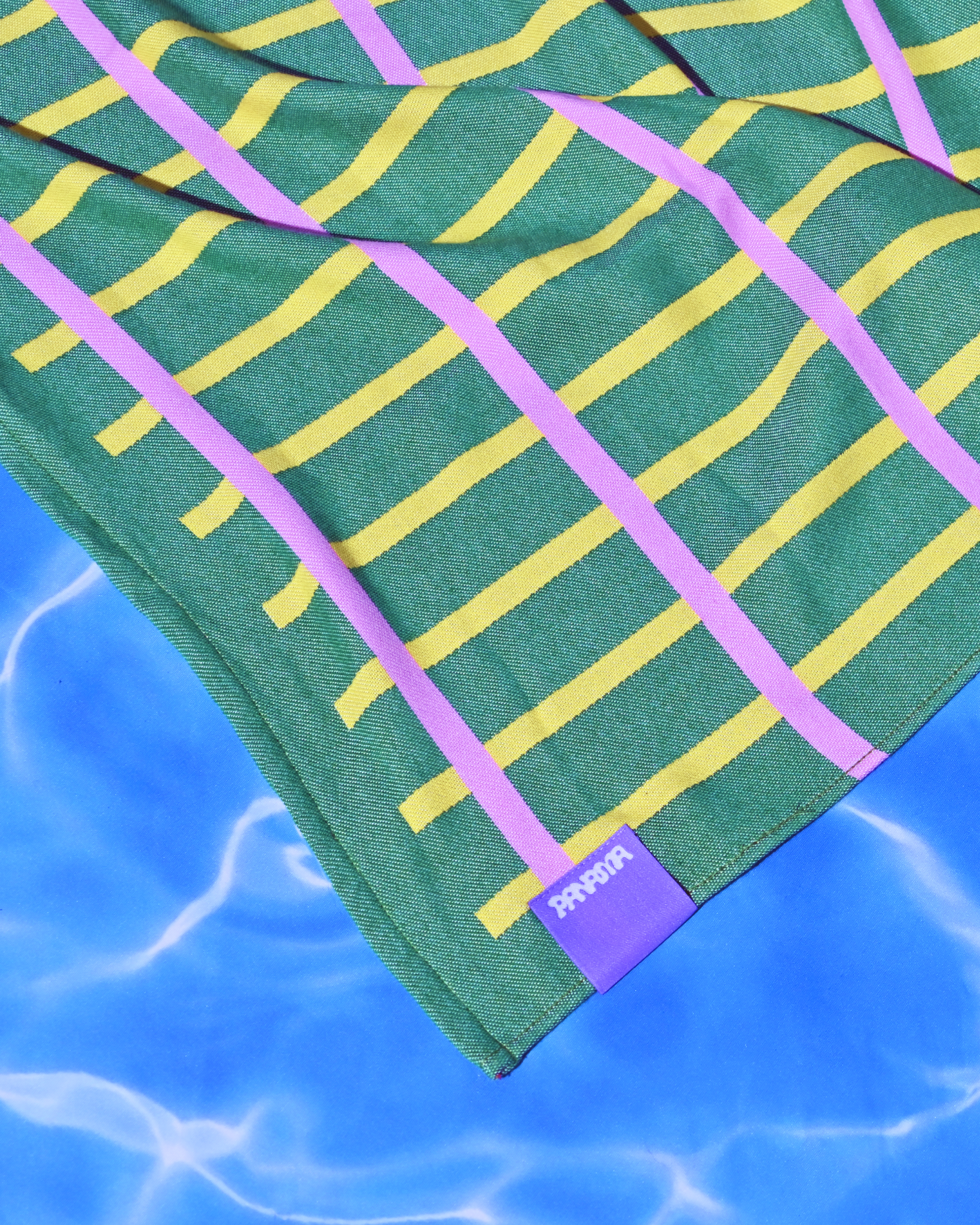 A refreshing green checkered pattern imitating the neighbor's fence on the property, broken up with pastel pink and a touch of lime green. Fresh, summery, and utterly uninspired. The jacquard cotton and bamboo fabric wraps you in after a bath and dries quickly, and thanks to the clever elastic band, you can roll it up into a small cube and throw it in your bag. It's perfect for anywhere you need a moment to yourself—on the grass, at the gym, or on a rocky beach.
