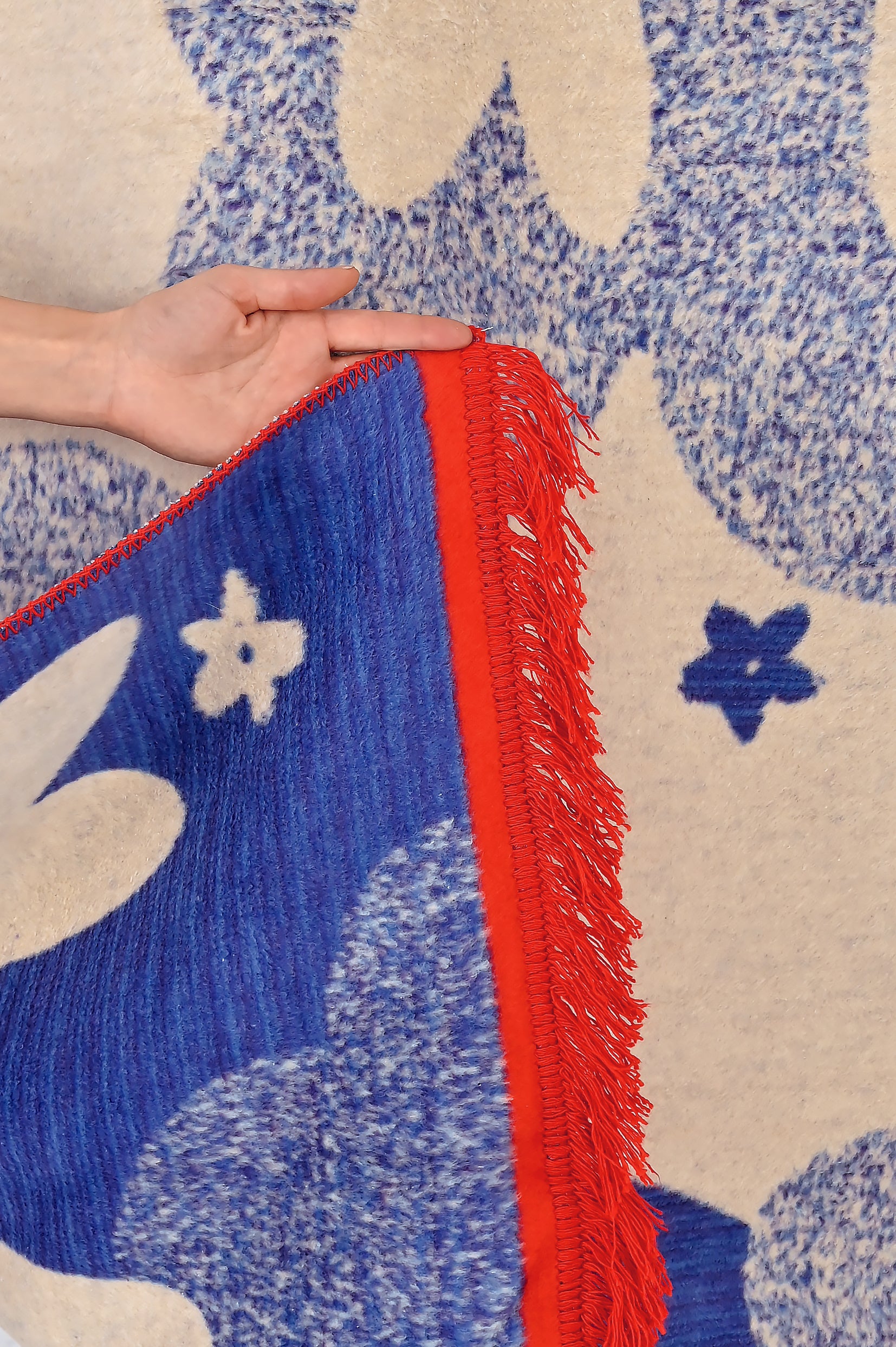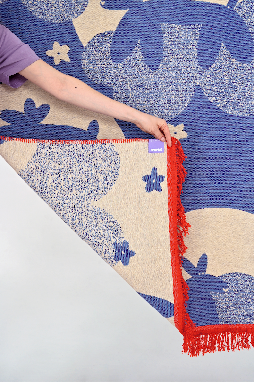 The pattern in the combed fabric version—a fluffy blanket—will be more intense in color than its counterpart in the smooth, unpiled fabric. This is due to the presence of fluff, which in the combed fabric covers the white warp threads. In the smooth version—a rug—this process is omitted, so the white warp in the composition brightens the pattern.