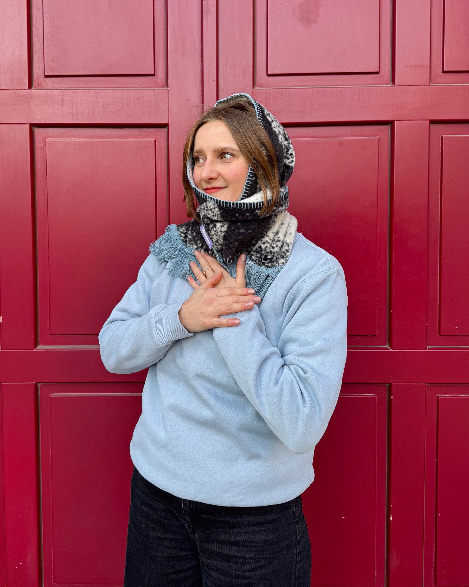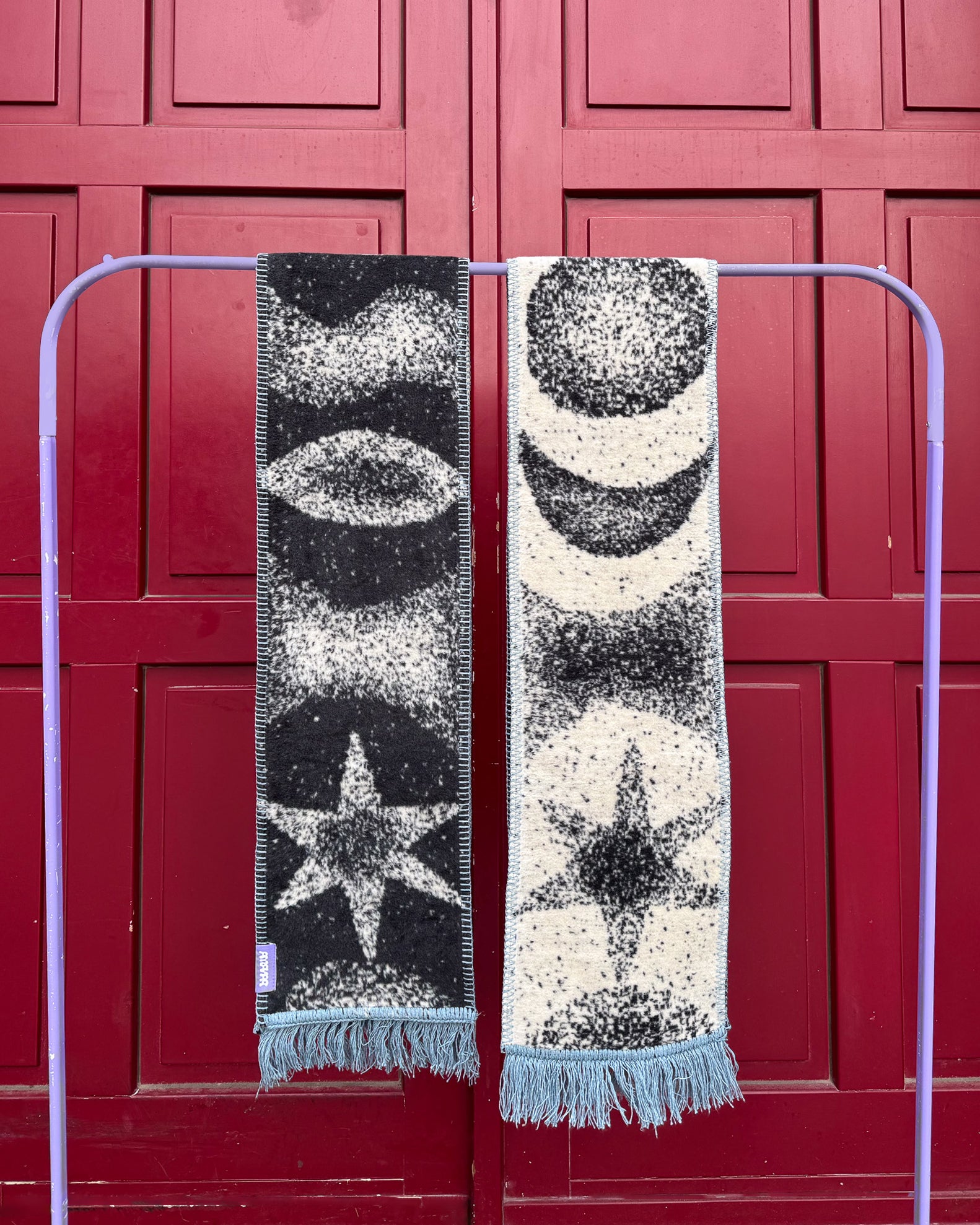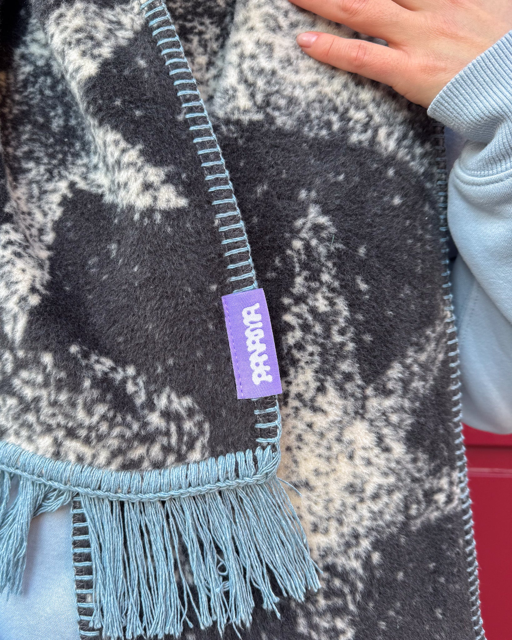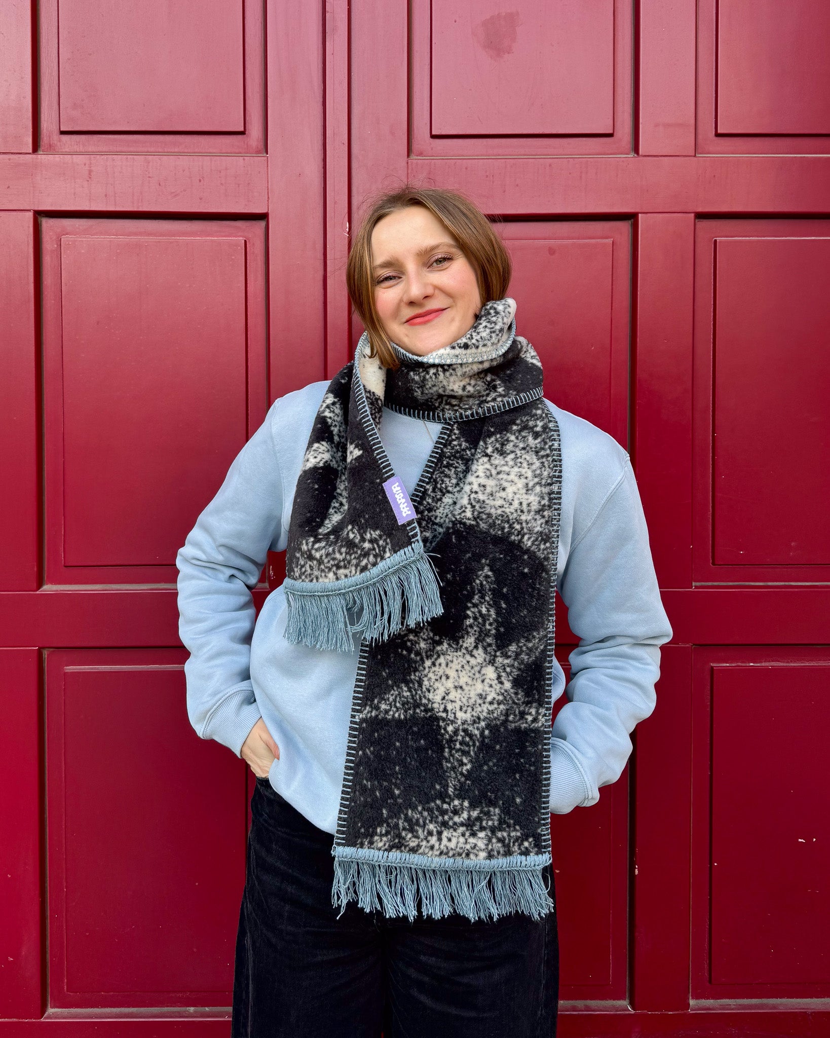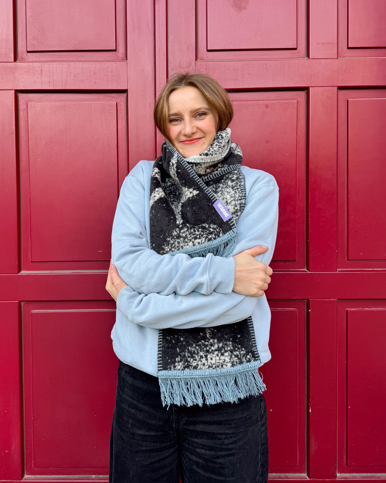 Aurora to nocne niebo. Grafit i beż w abstrakcyjnych kształtach, które układają się w gwiazdozbiory. To kompozycja graficzna, a jednocześnie organiczna – pełna detali i subtelnego ruchu. Wykończone chłodnym błękitem idealnie zamyka się w formie szalika.