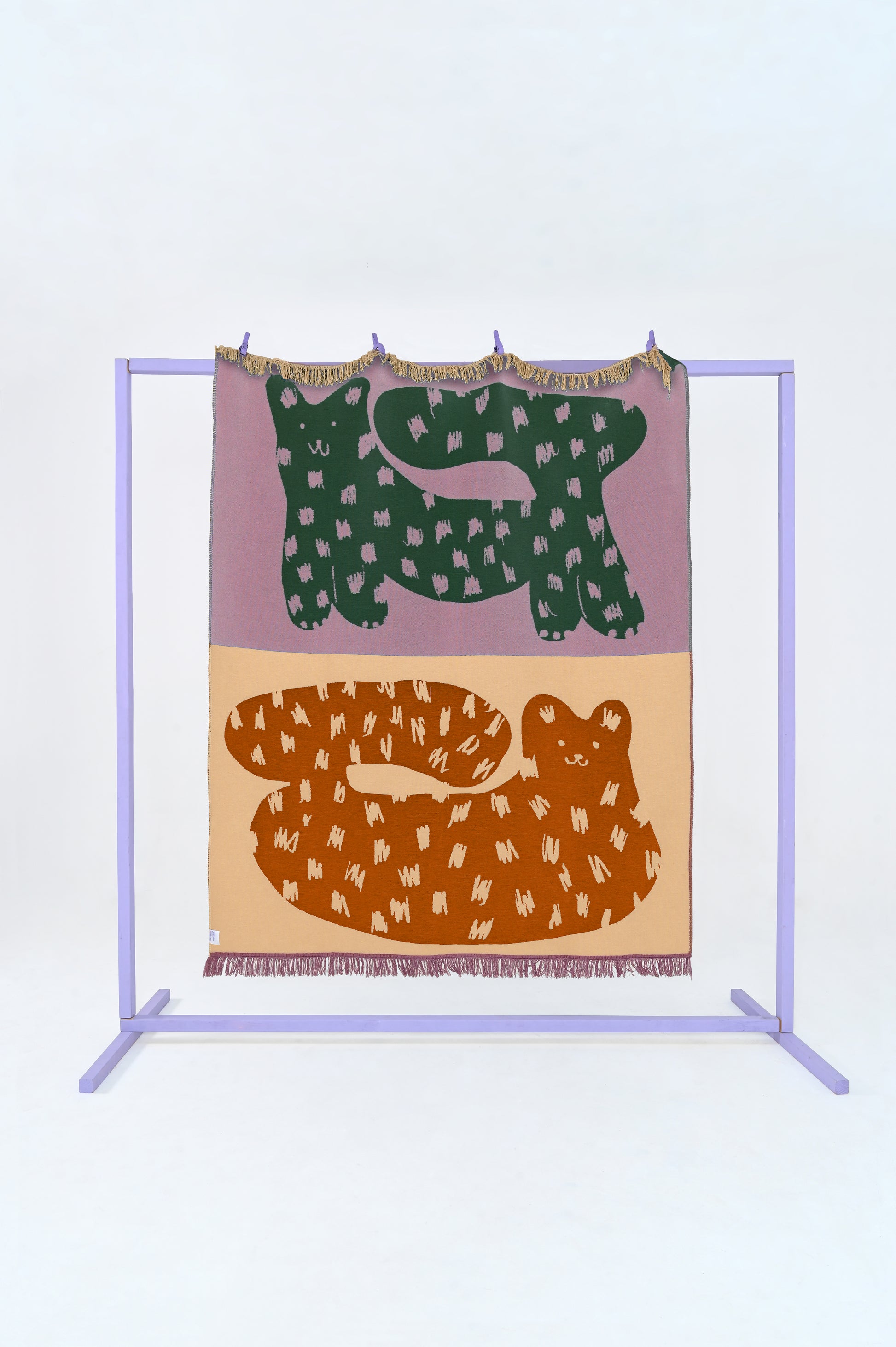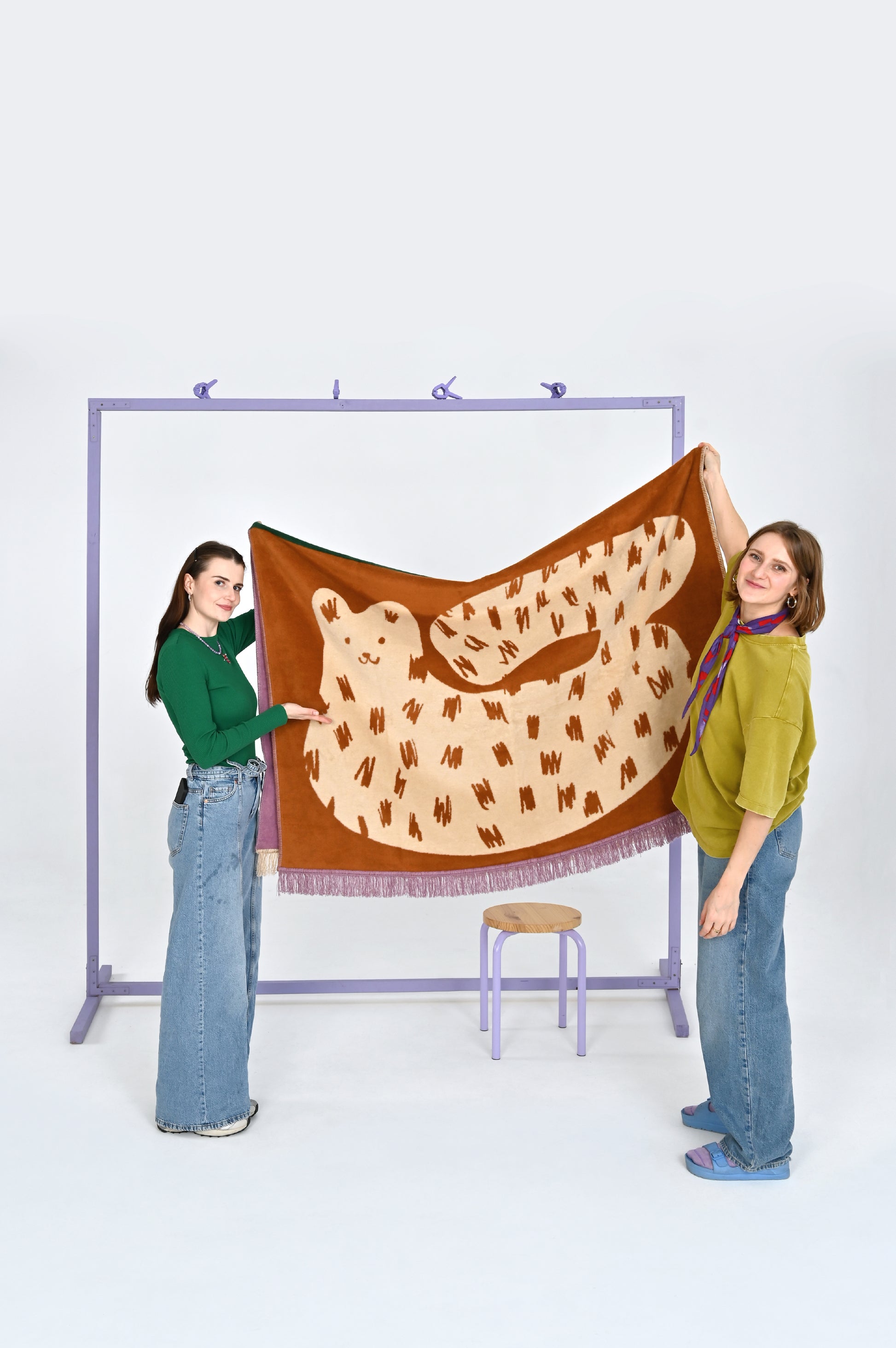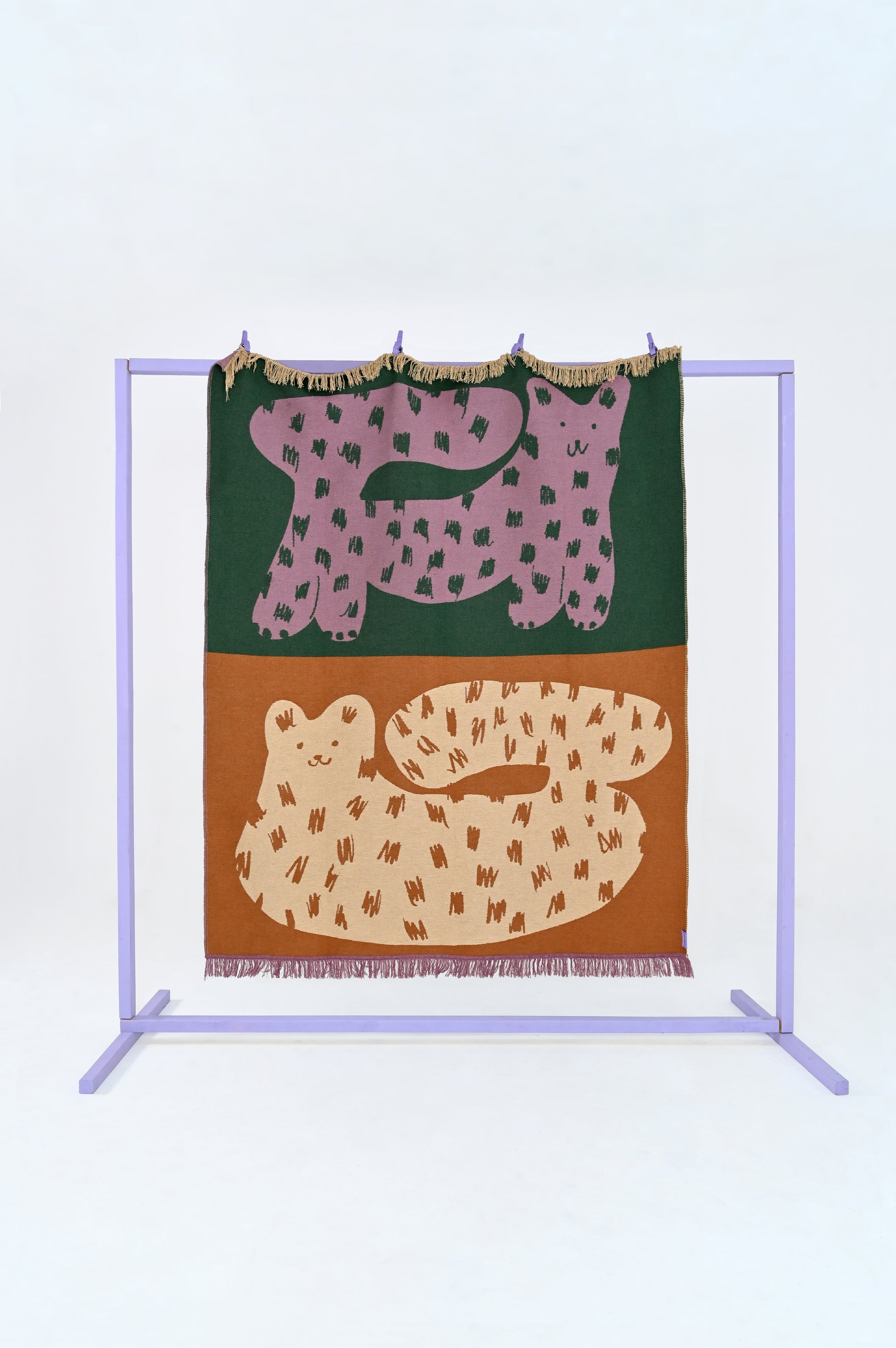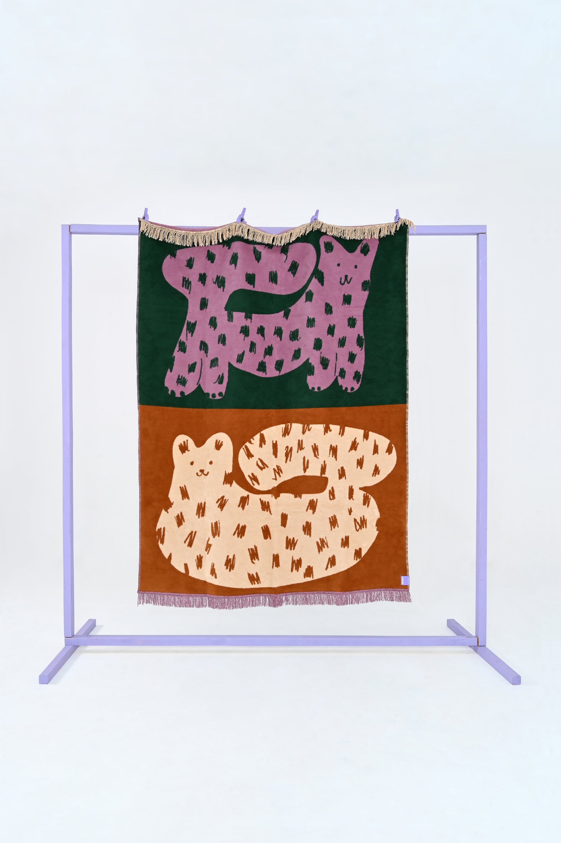 Koc, który sprawia przyjemność – nawet jeśli po prostu leży. Dwa koty w dwóch nastrojach, narysowane grubą kreską i utkane w zgaszonych kolorach: zieleni, brązu, fioletu i ciepłego beżu. Trochę jak ilustracja z bajki, trochę jak popołudnie z herbatą i mruczeniem w tle.
