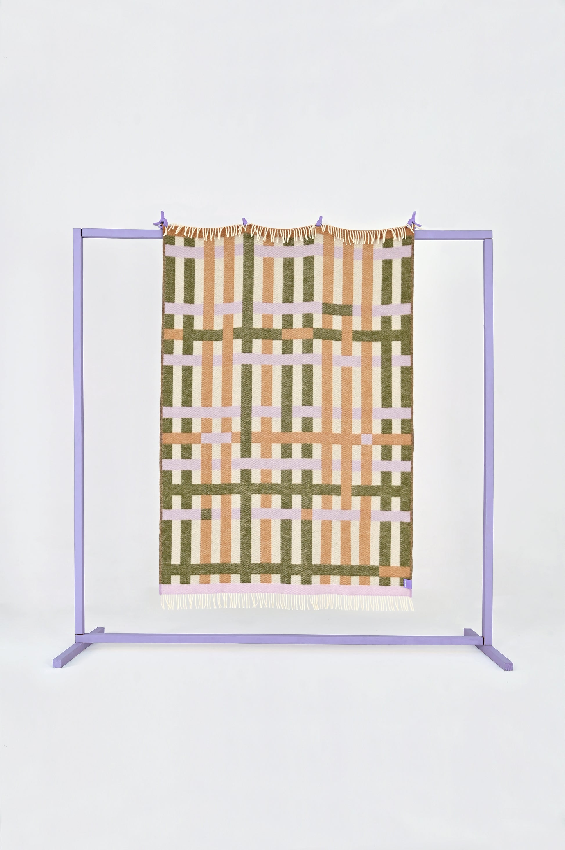 Żakardowy koc wełniany HIPI, to geometryczna dekonstrukcja kratki, łącząca oliwkową zieleń z delikatnym fioletem i karmelowym brązem, zbalansowane delikatnym beżem.