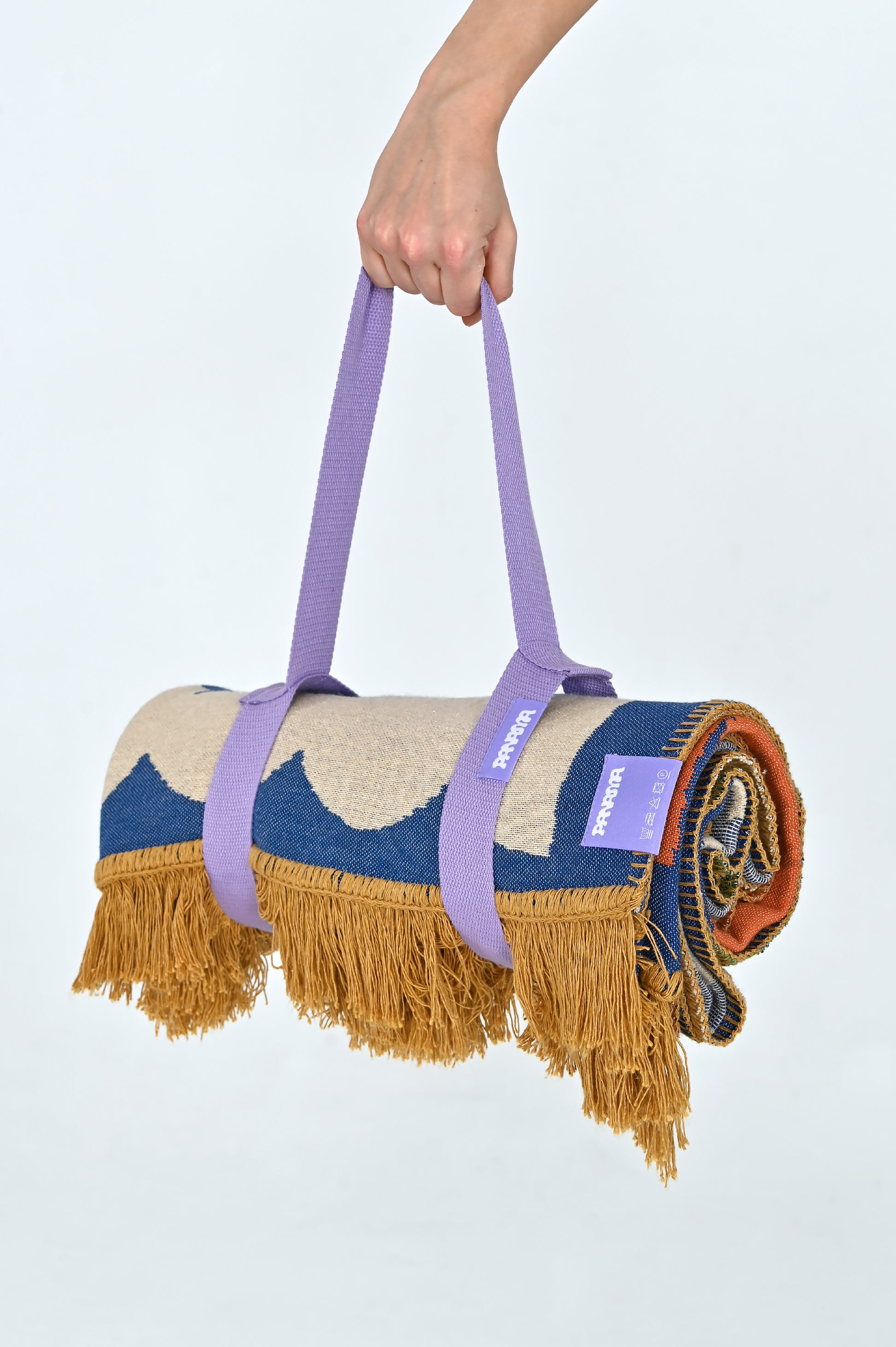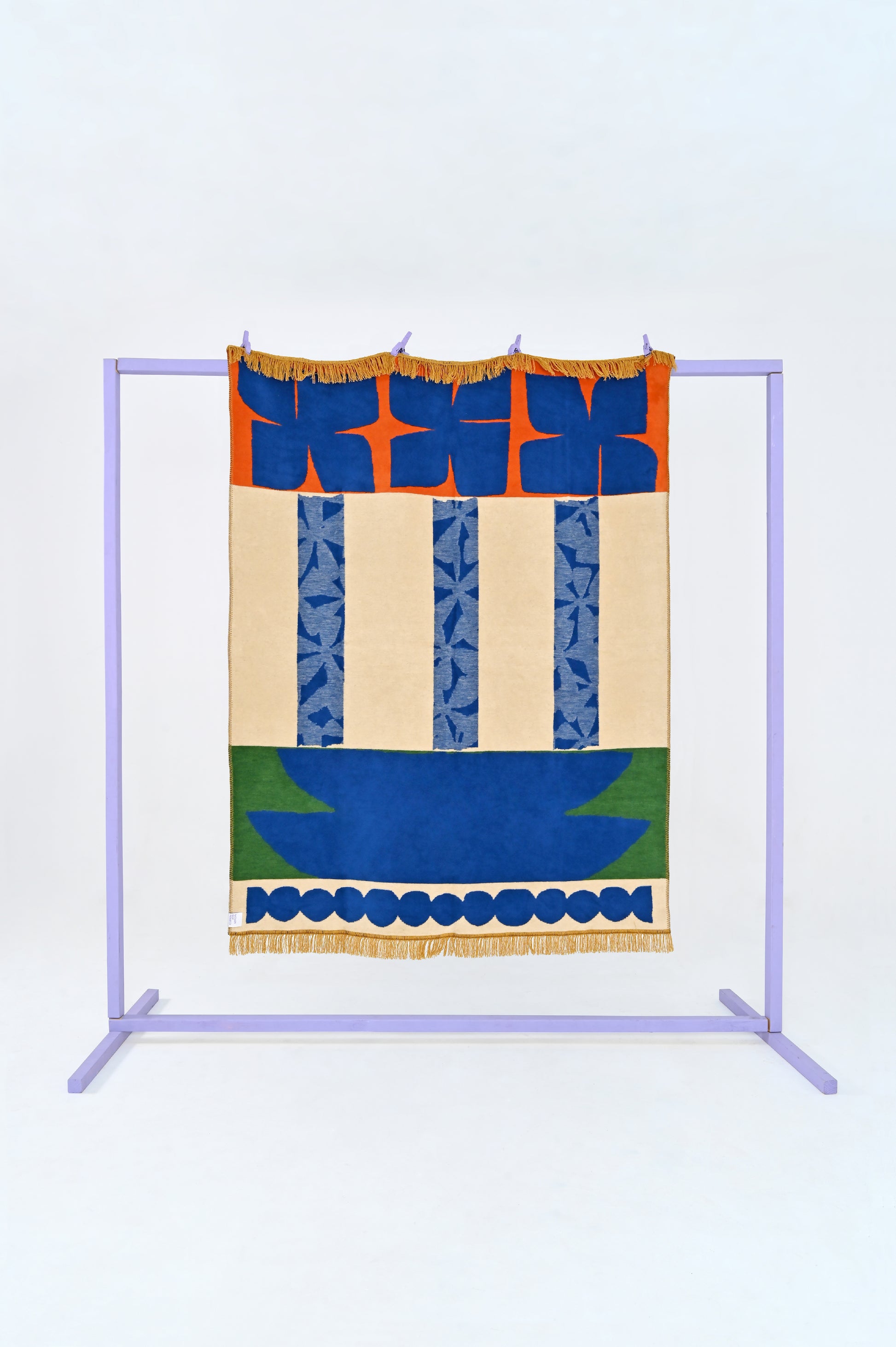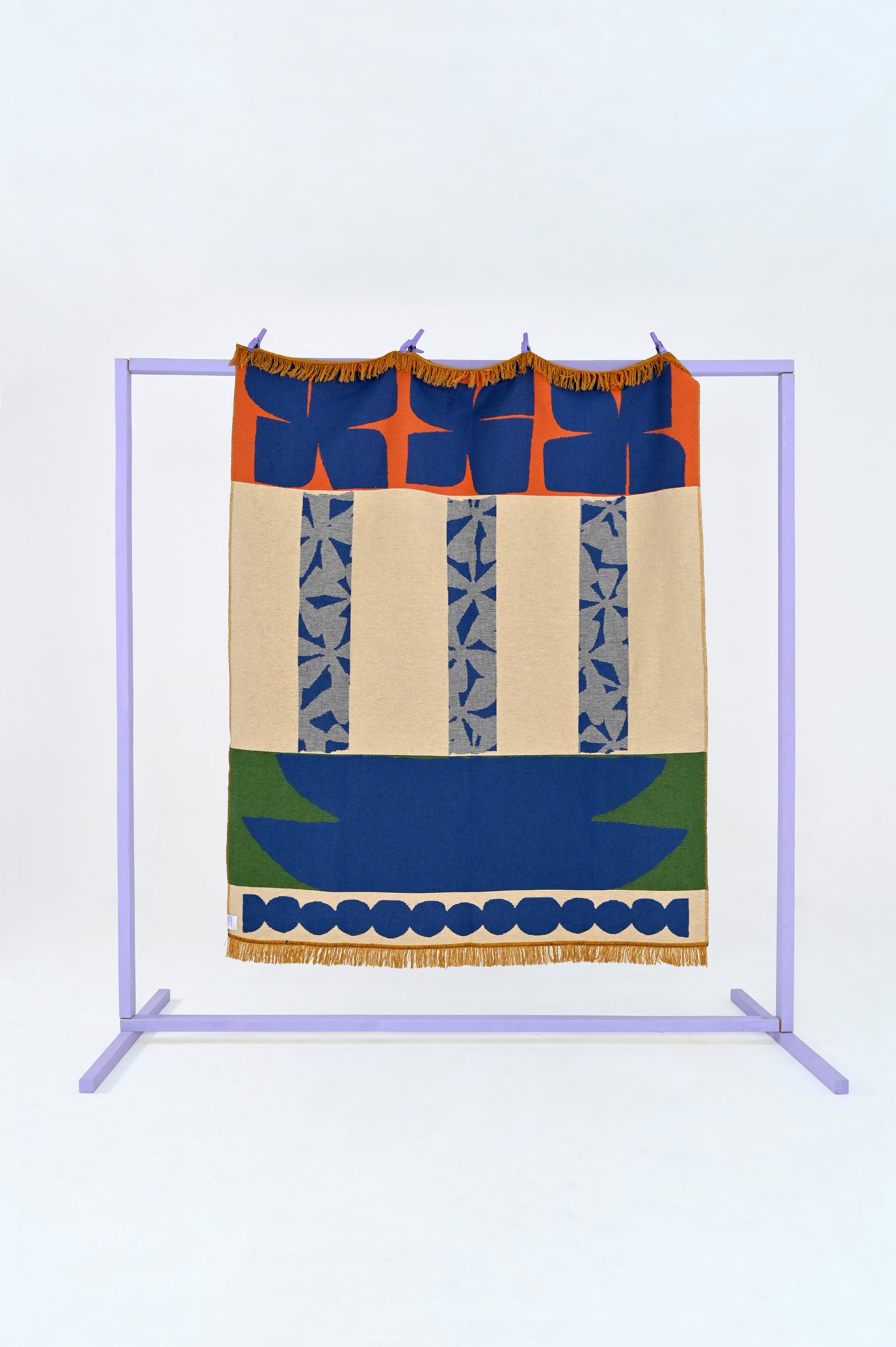 Trzy miękkie kształty na kobaltowym tle. Zieleń, beż i pomarańcz budują tu spokojną kompozycję. Graficzny, ciepły koc wnosi do wnętrza przede wszystkim wyrazisty kolor, a jednocześnie miękko się rozlewa w przestrzeni. Ten koc po prostu dobrze mieć obok siebie.