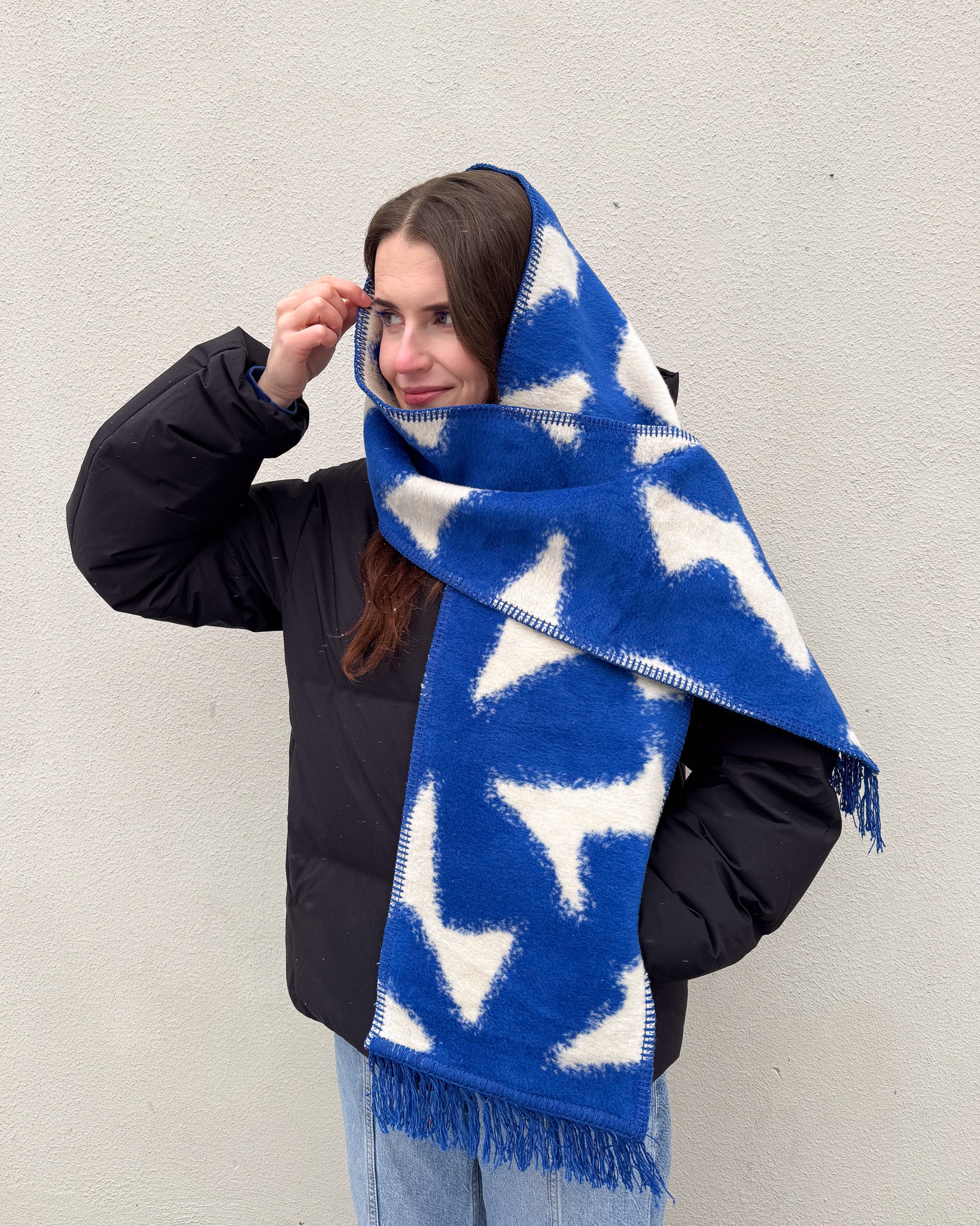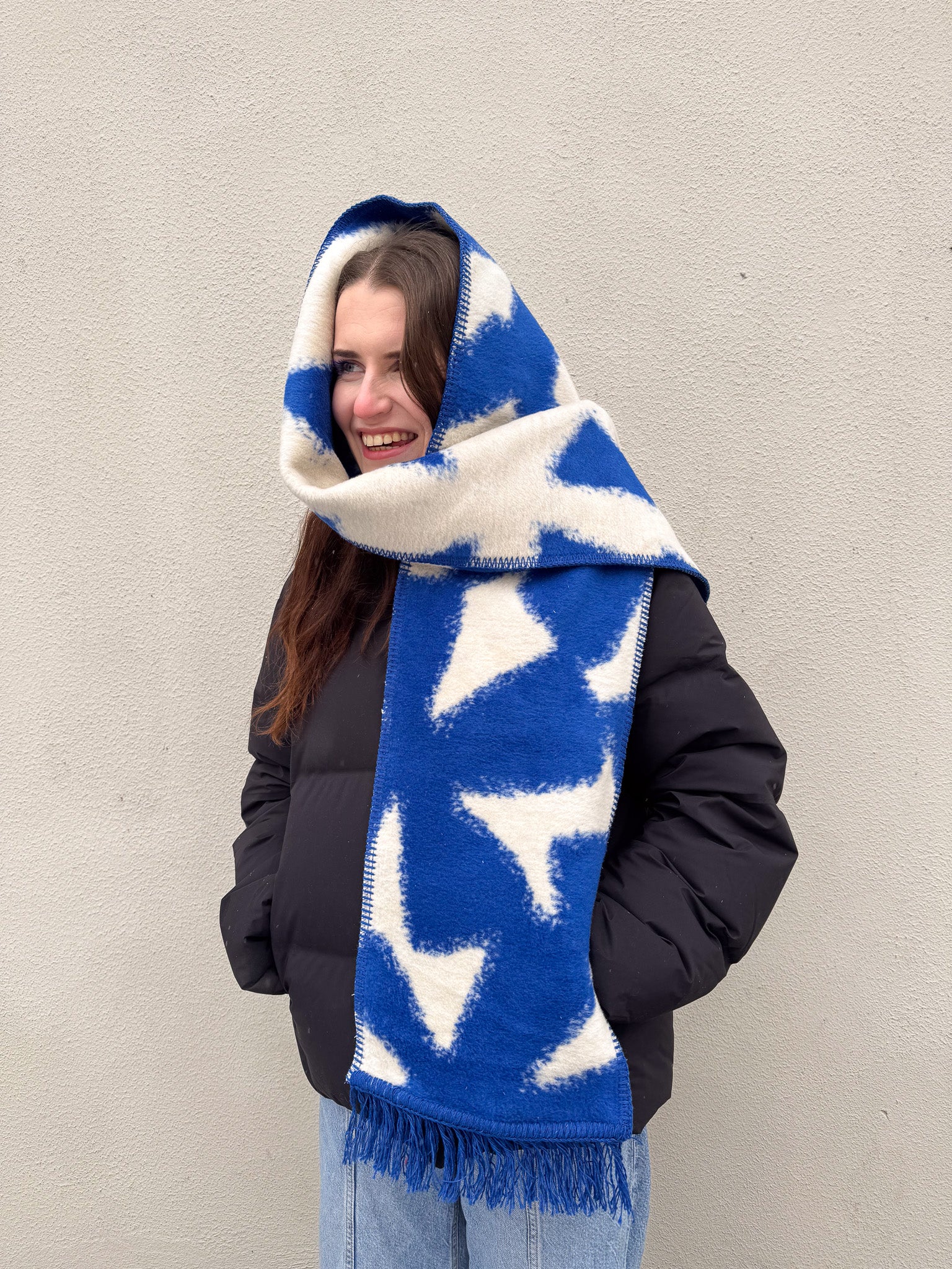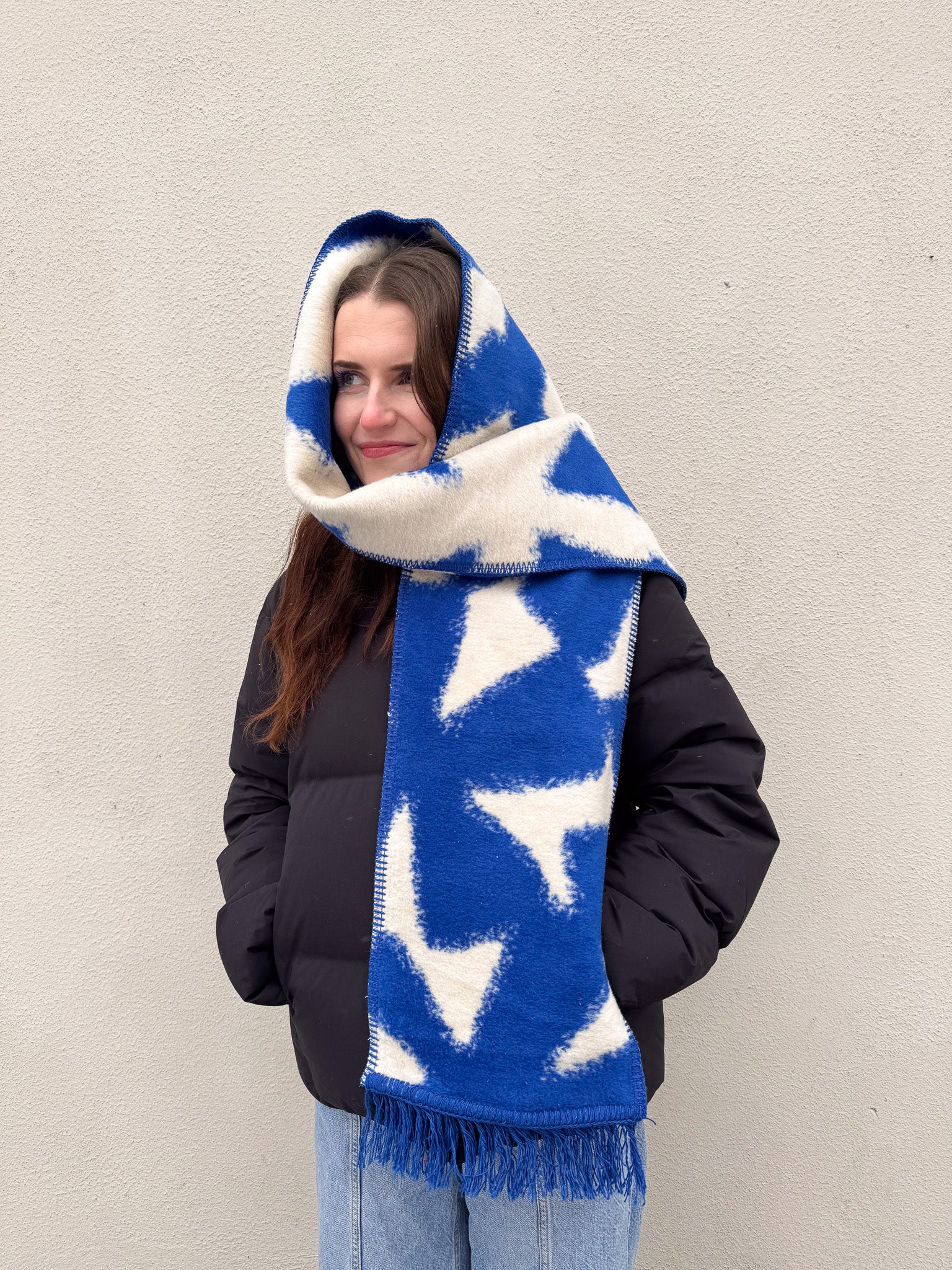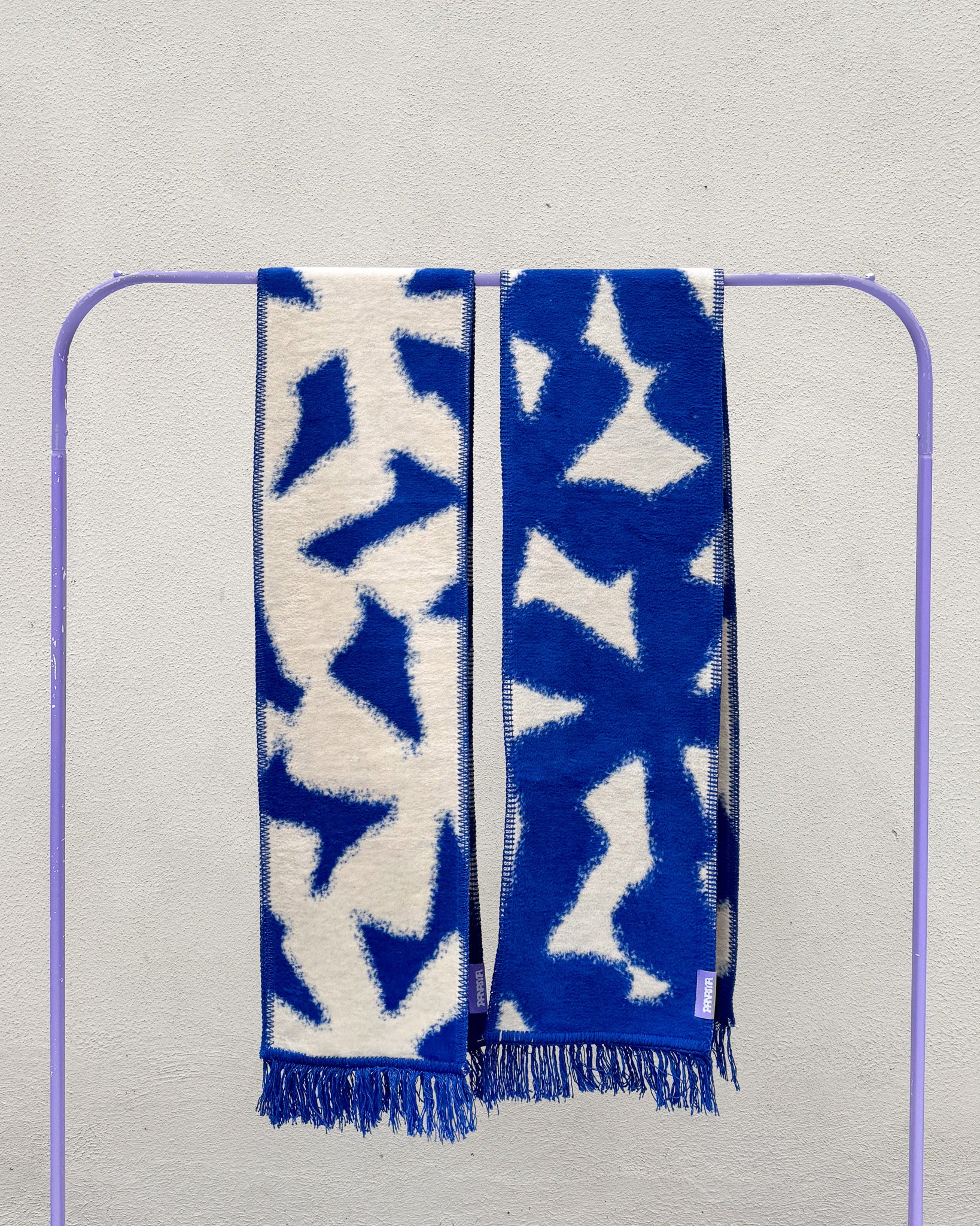 Kobaltowe kształty na jasno beżowym tle, wykończone kobaltowym szydełkiem i frędzlami - the hottest szalik here it is!
