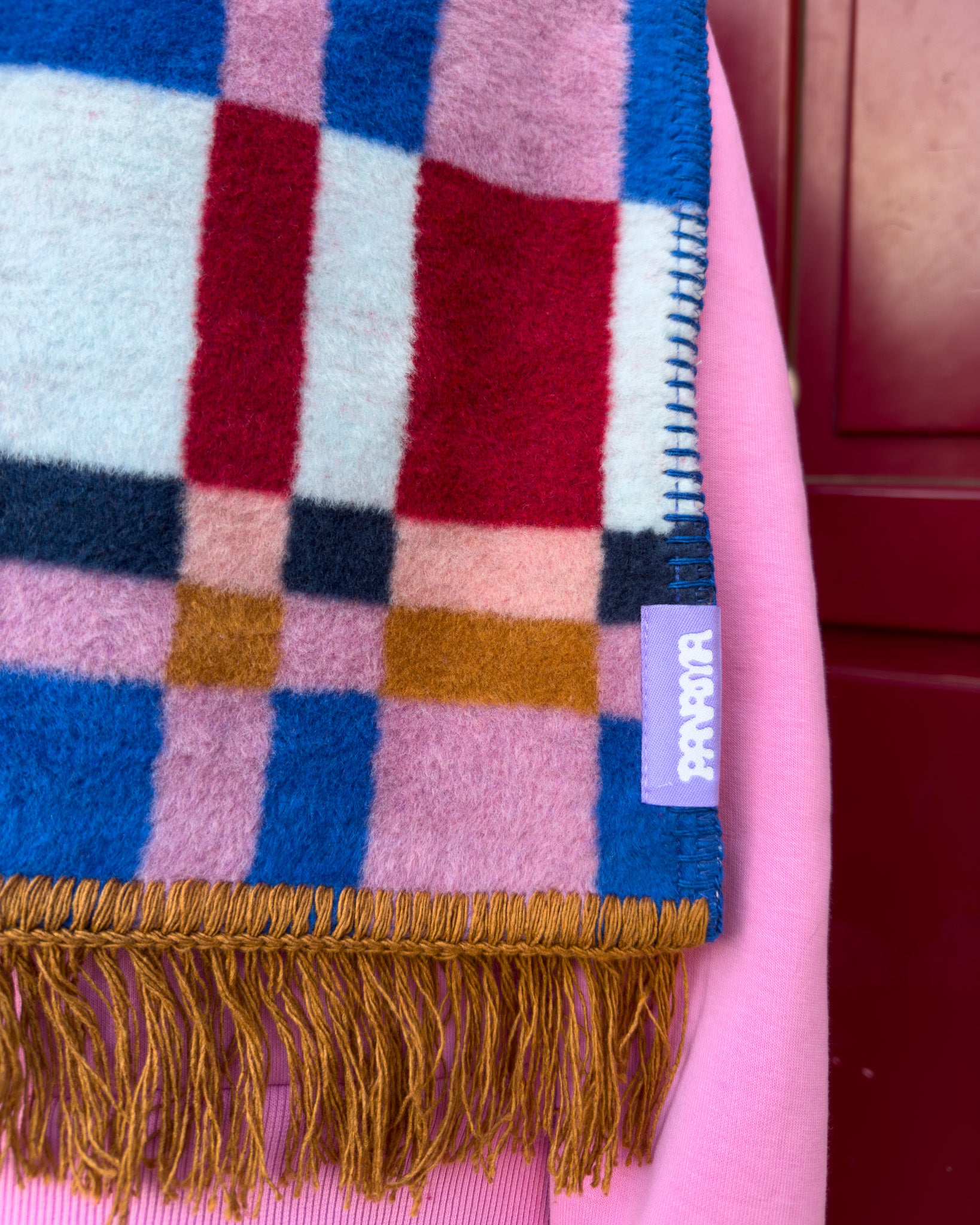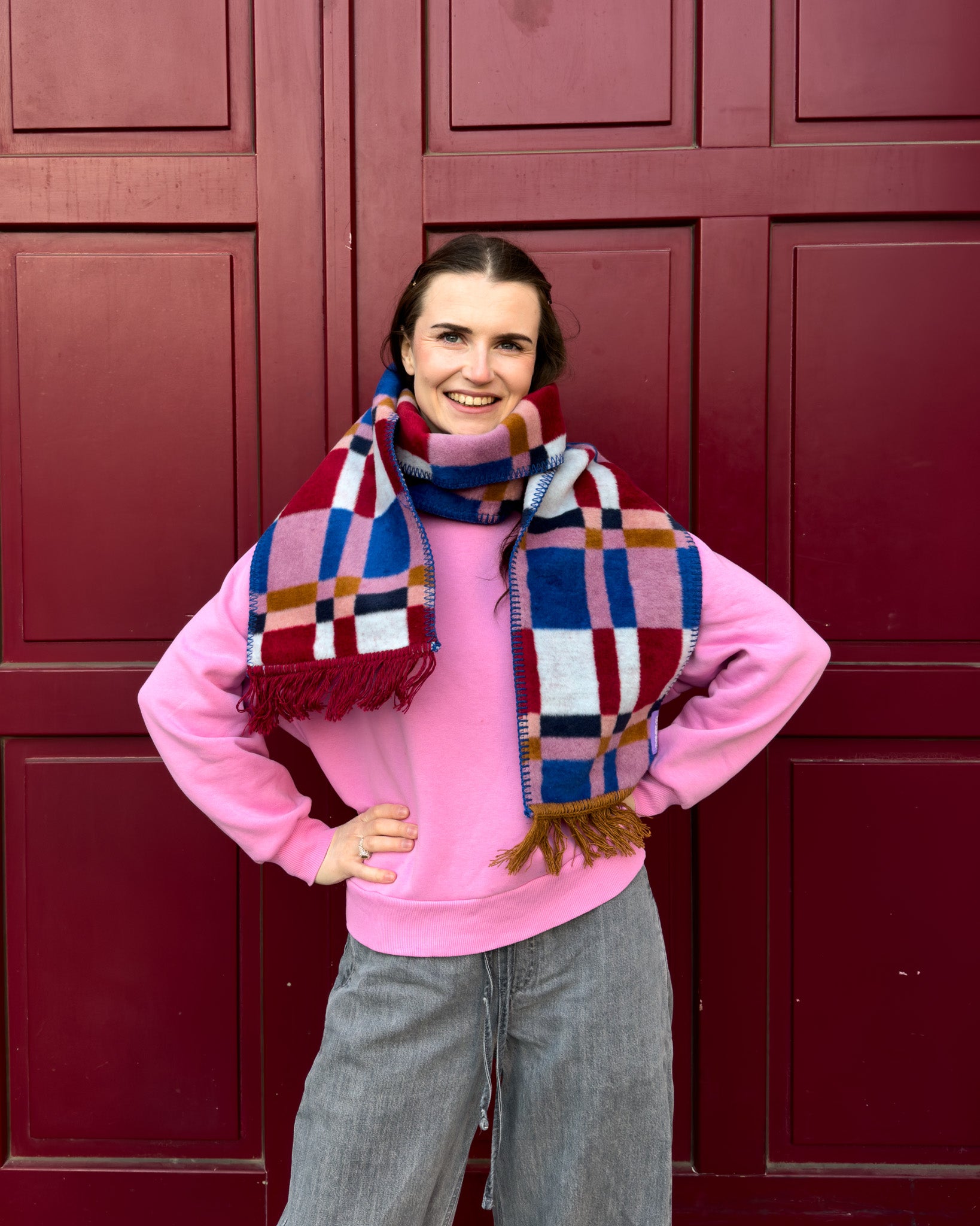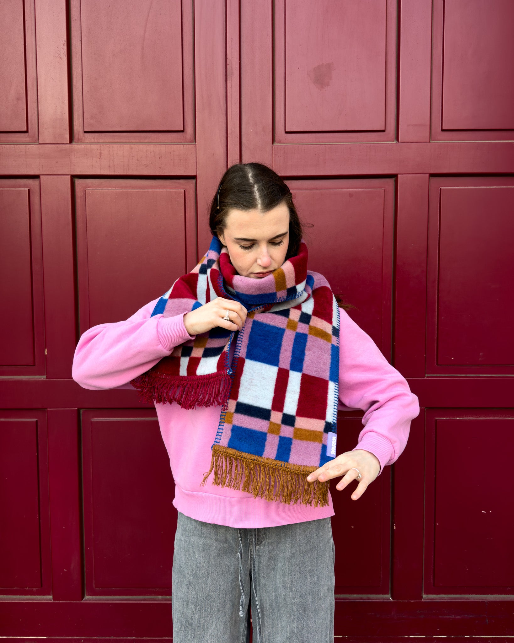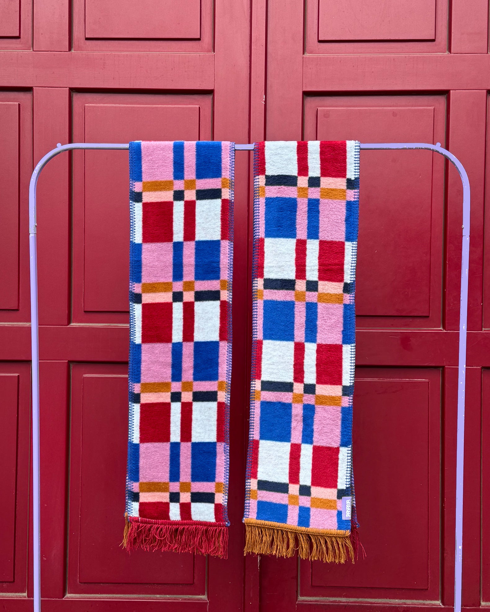 Retro i pełen życia - MADRAS to miks kolorów, w uporządkowanej kracie. Panamowy MADRAS to nasycony granat, delikatny błękit, bordo, róż i dwa odcienie brązu. Tutaj w formie szalika!